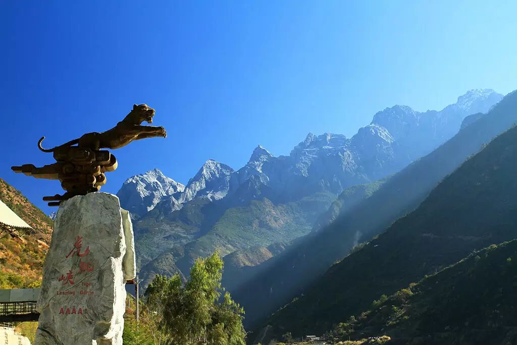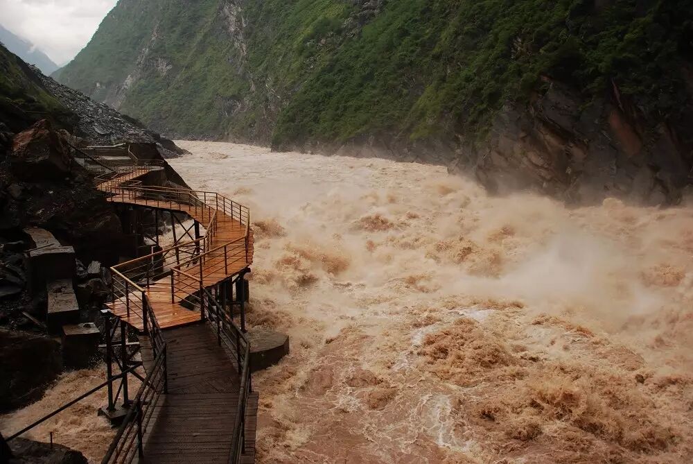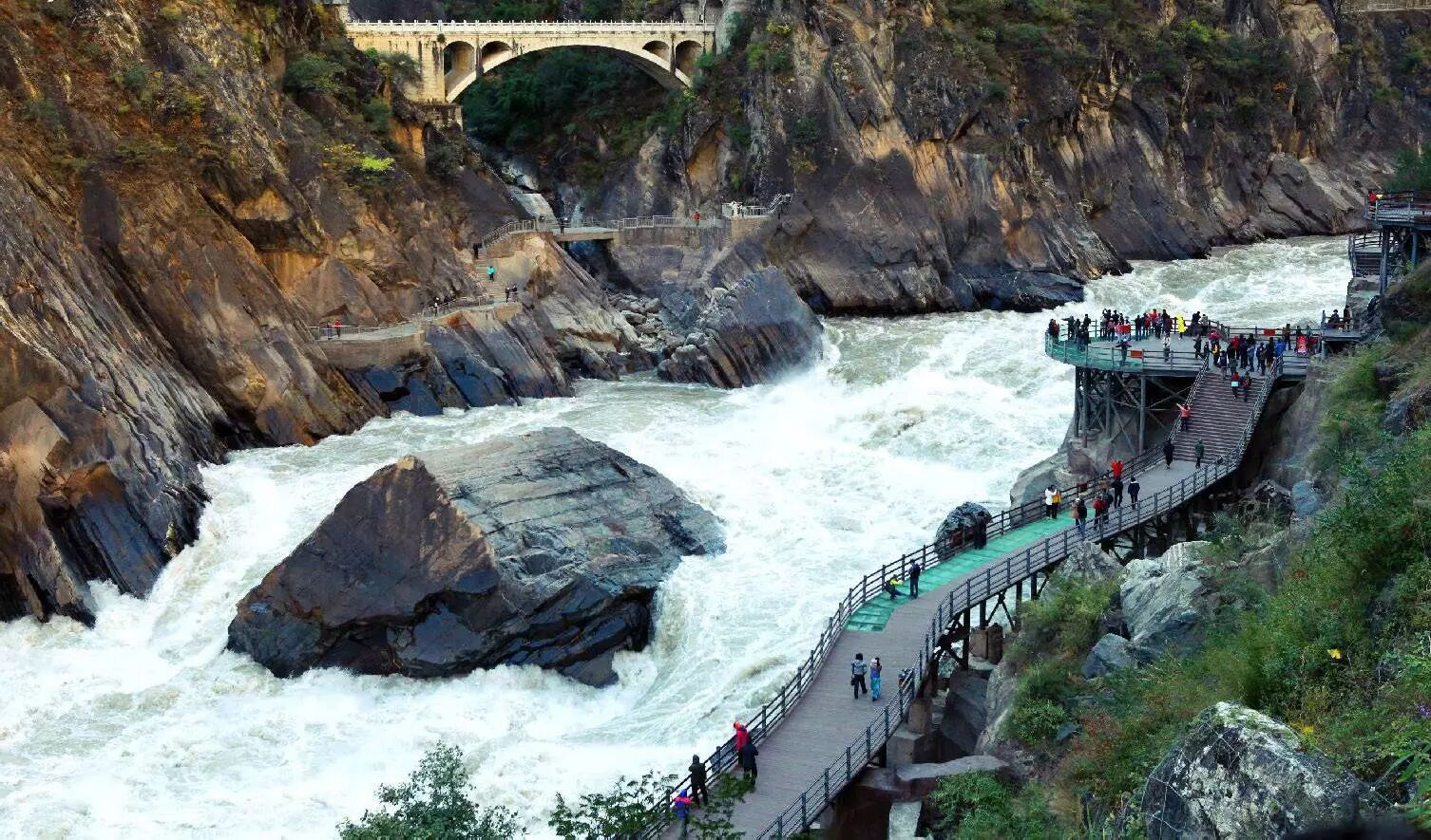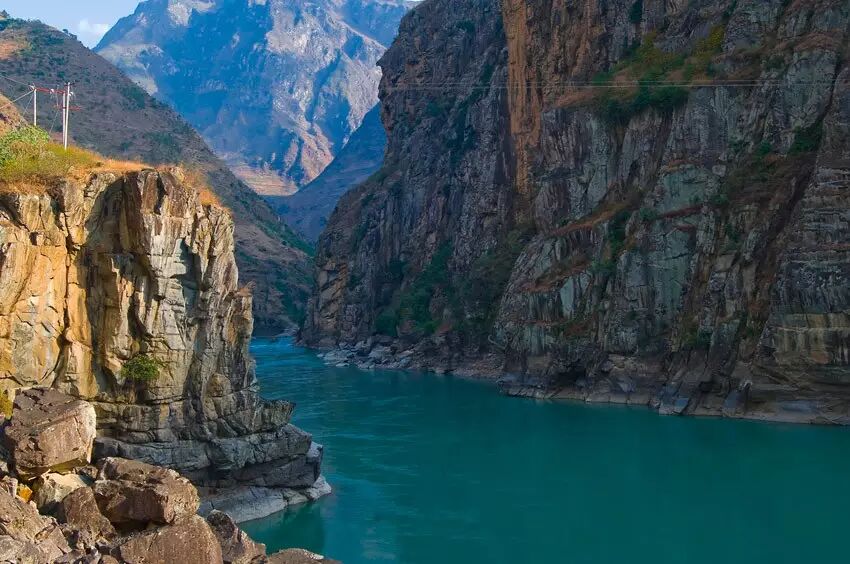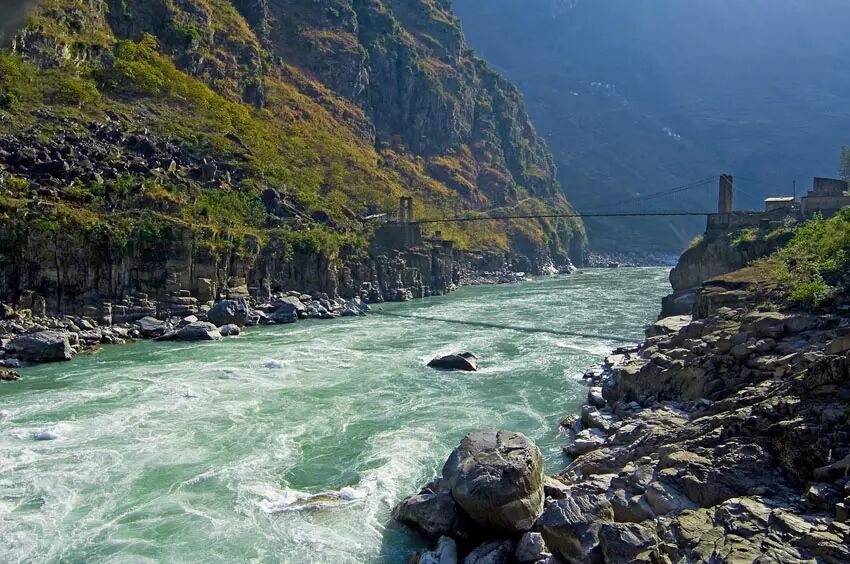 虎跳峡,一向以“险”而闻名天下。这里首先是山险。峡谷两岸,高山耸峙。东有玉龙山,终年披云戴雪,银峰插天,主峰海拔高达5596米,山腰怪石镲峨,古藤盘结,山脚壁立,直插江底,虎啸猿啼,狼豹出没;西有哈巴雪山,峥嵘突冗,山腰间有台地,山脚为陡峻悬崖。西岸山峰,高出江面3000米以上。