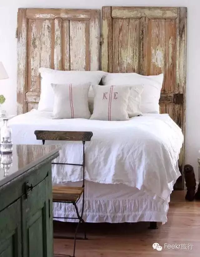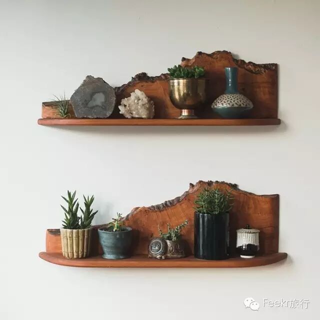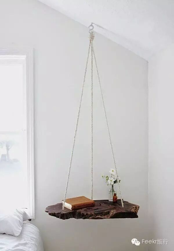 ▲捡来的木头悬挂在床头,就是一个浪漫的床头柜,放书不错~