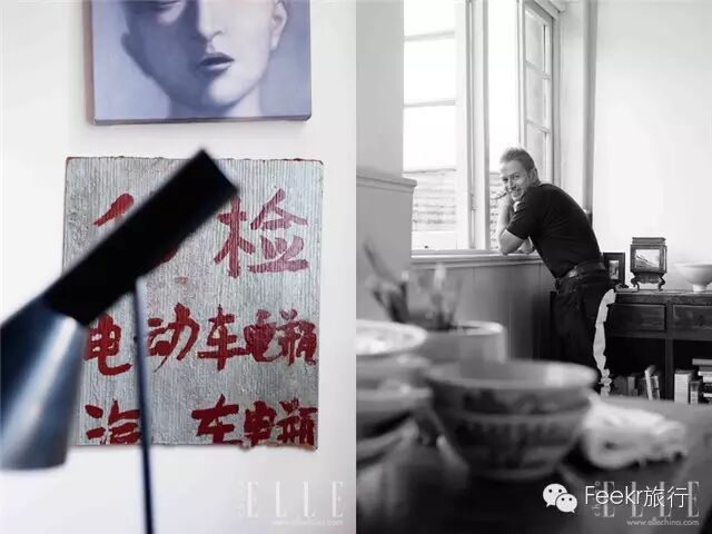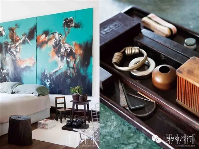 “留意日常之美,不是古董也能表现出醇厚之味”,这是作为大厨的Craig对自己怀旧混搭风格的家最好的诠释。床几乎就摆在房间的正中间,墙上巨大的油画名为“武松打虎”,购自西安,床边摆设之物全为旧物,无一是古董。