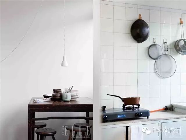 放在阳台另外一头的一套八仙桌,因为迷恋这种无钉的榫卯结构,Craig特意收集了很多圆凳来配套。虽然身为大厨,Craig居所的厨房却非常简易。现代设计名品和各类旧物相得益彰,桌上插花的花器是Craig捡来的。
