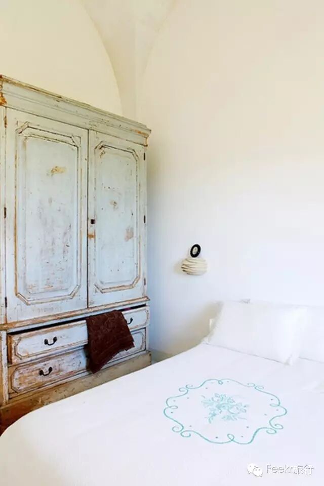 ▲富有年代感的柜子和床单上的印花相得益彰。