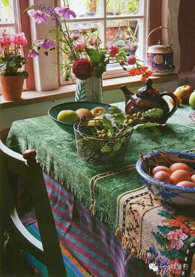 本以为她的家应该是现代又时尚的,结果太惊人了:拼布与印花充斥着异域的美感,古怪旧物堆砌出生活的乐趣,天花板上层层叠叠的美丽布料,被窗口吹进的风灌满,在这样一个空间里,很难让人再去纠结色感与平衡,有的只是尽兴、快乐、自由,曾有一颗嬉皮心的你,是否也想住进去。