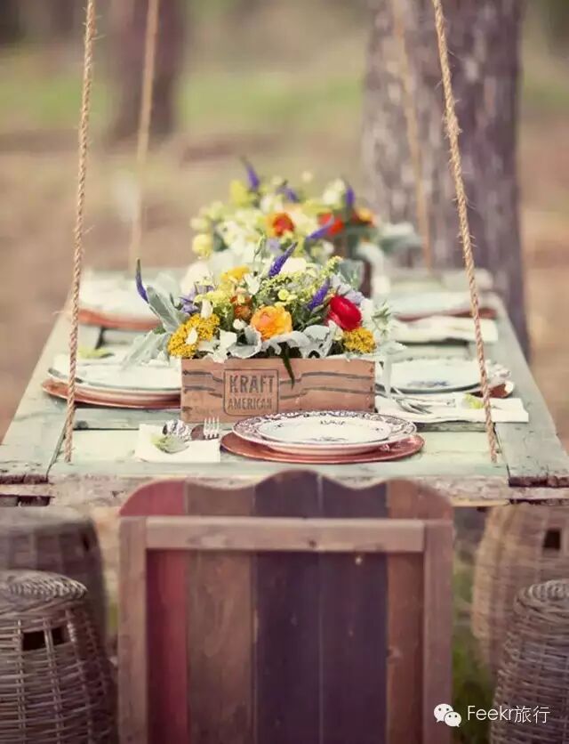 ▲破木门漆上自己喜欢的颜色,变成了餐桌,悬挂的户外餐桌简直太梦幻。