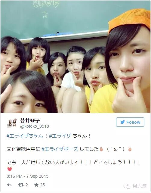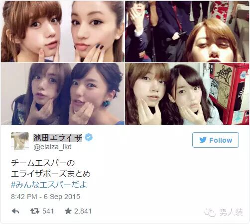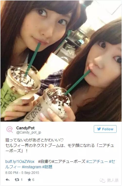 当其他亚洲国家女子还停留在瞪着死鱼眼嘟嘴的境界,日本杂志《CanCam》的头牌模特,Eliza Ikeda自创了捏唇大法。很快这种手法就在少女之间流行,专门用于凸显唇彩。池田エライザ(下图中反复出现的那位)也因此被誉为自拍美神——