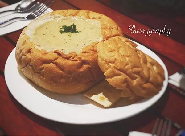 友情推荐:面包蛤蜊浓汤,面包做的容器,汤汁很浓,味美料足。