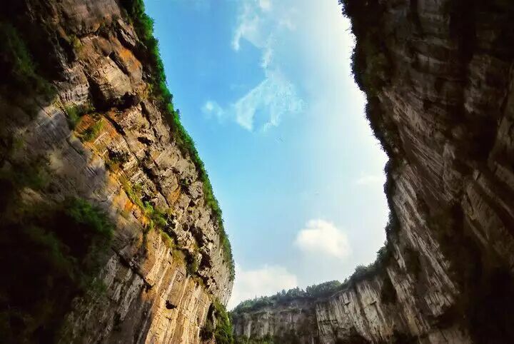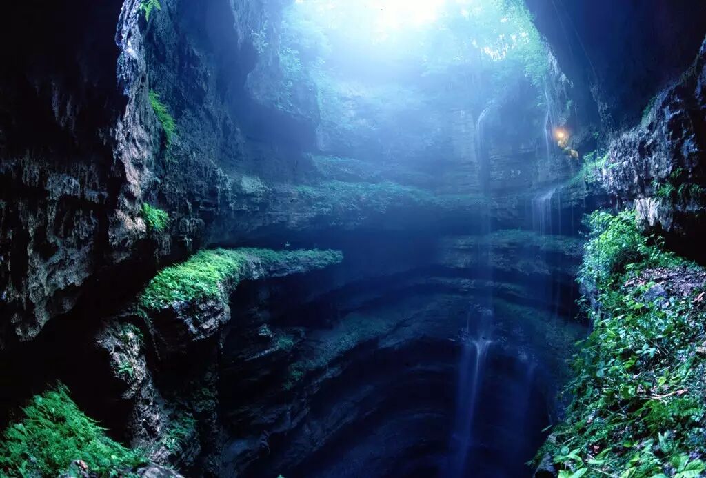 武隆天坑是大自然留给人类的神奇造化之谜。自坑口视之,绝壁陡直,深不可测,奇险无比。自坑底仰视,四周绝壁直指天穹,引颈仰视,白云悠悠,天空湛蓝。天坑入口,需要乘坐高速电梯直下约200米深,方可到达天坑底部。