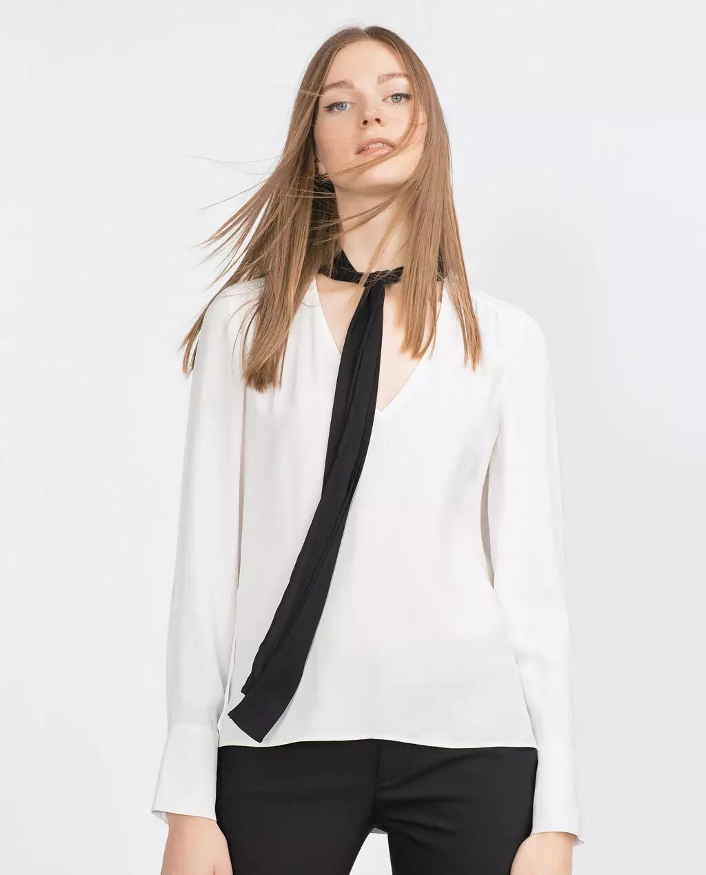 再来看看窄丝巾搭配衬衫的效果,沉闷的黑蓝色多了一份俏皮。