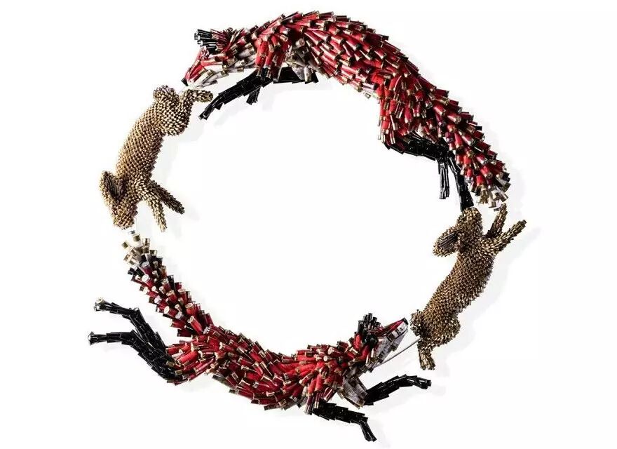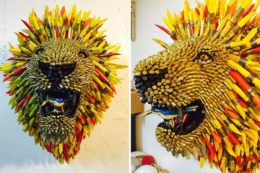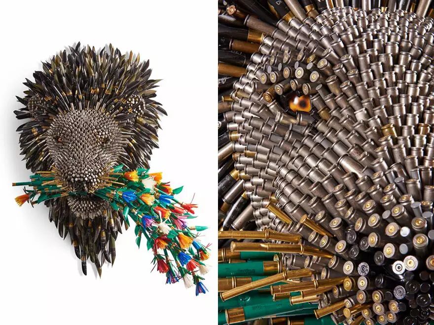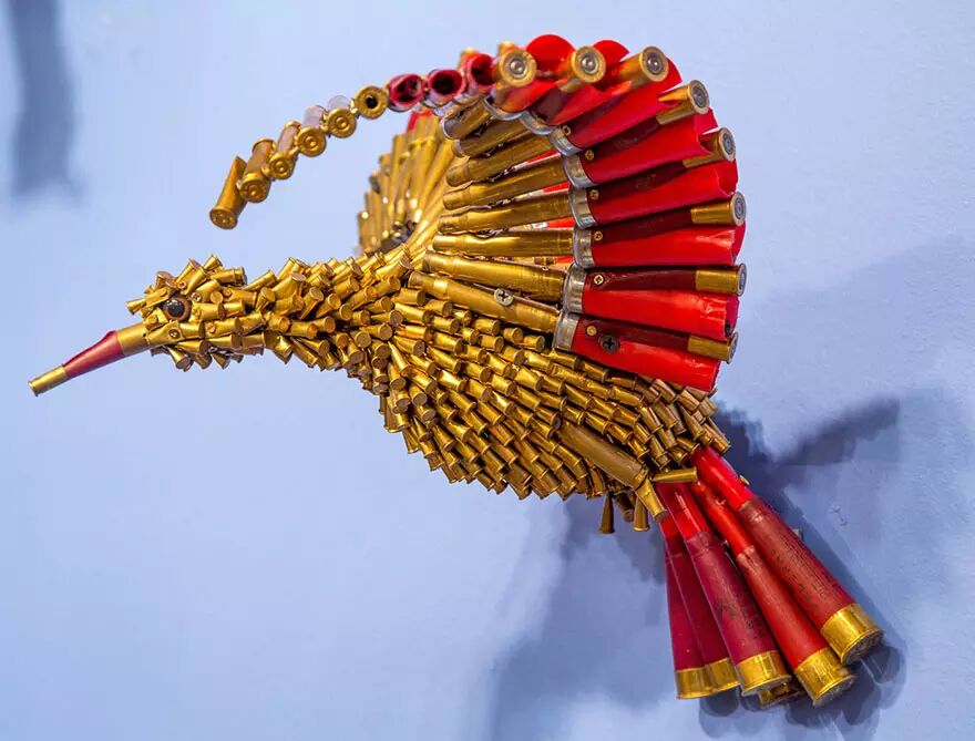 哥伦比亚艺术家 Federico 异想天开地用 1000 颗子弹壳做了一组充满活力的雕塑和浮雕画,作品多以动物和景观为主题,并命名为「我们的和平时代」,极具讽刺意味。