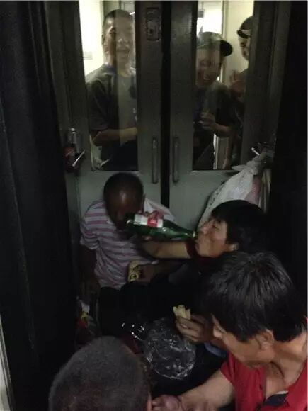 前面几列车厢都是新兵,不能过去,几位师傅坐在连接处开始卷起大葱卷饼,交换喝二锅头。门后新兵起哄拍门大喊我也要,师傅大骂“臭当兵的,有种你过来”然后新兵也隔窗开始骂xx(看嘴型),这边师傅又骂回去。