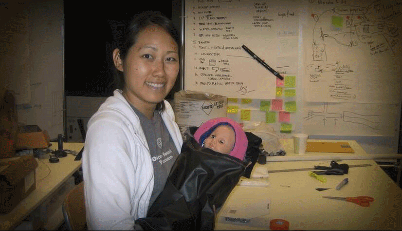 Jane Chen和队友捧着一个婴儿模型,