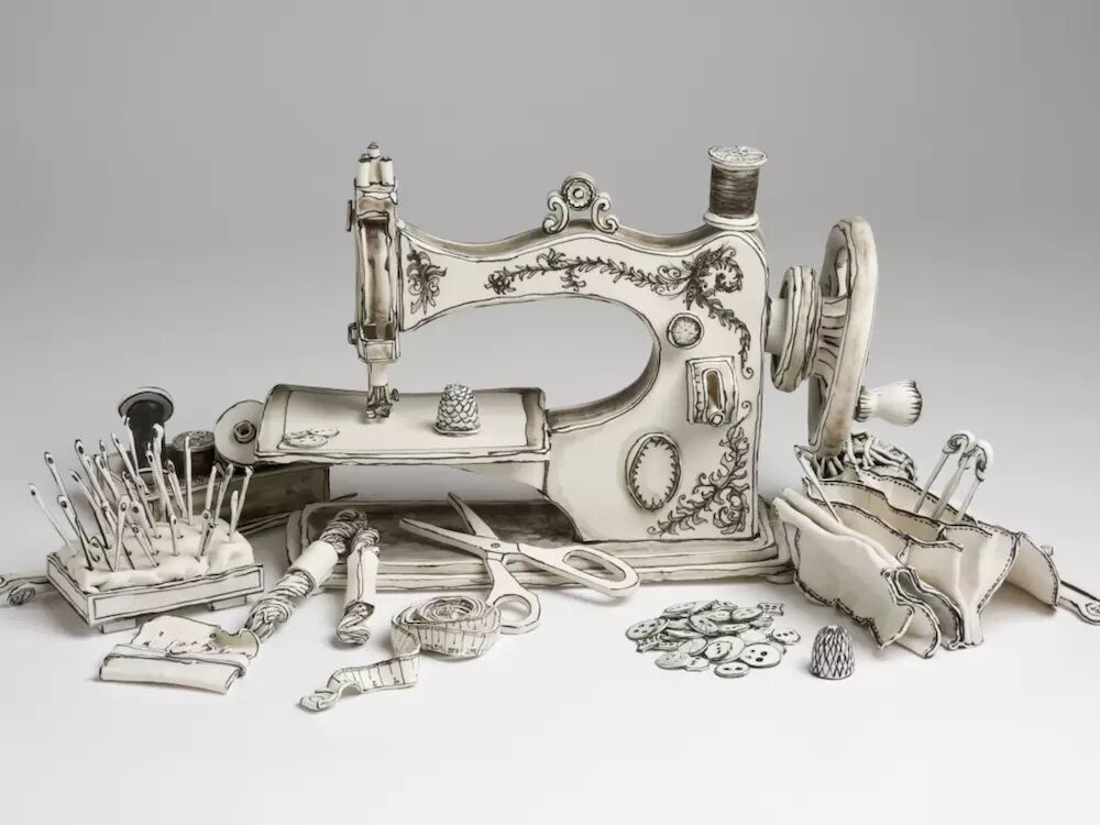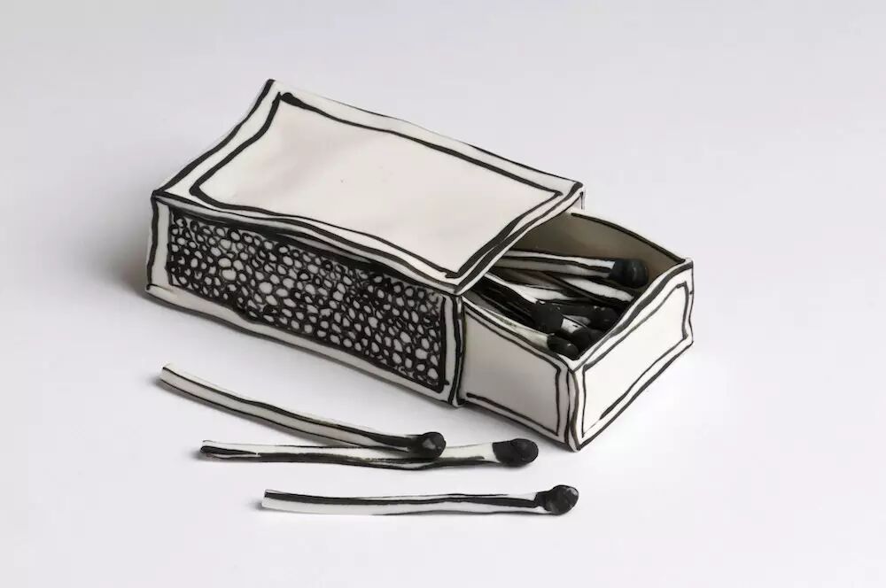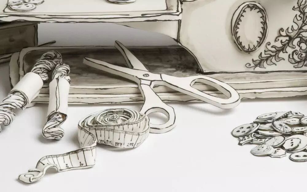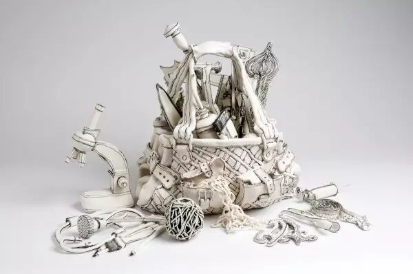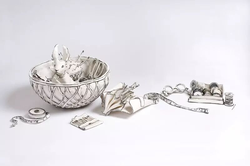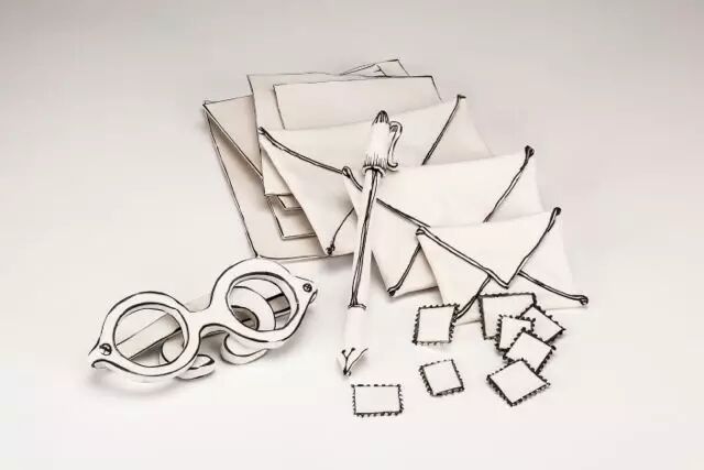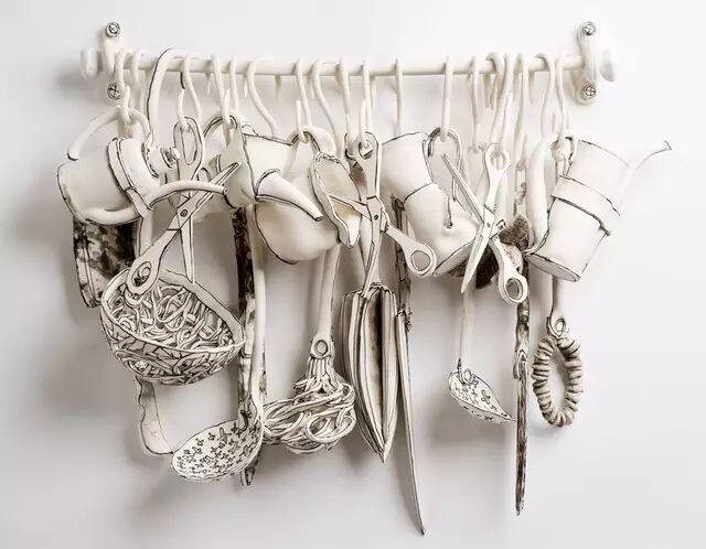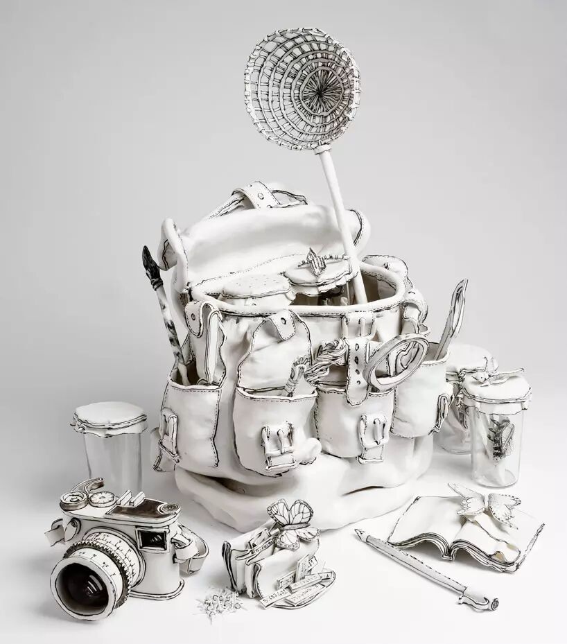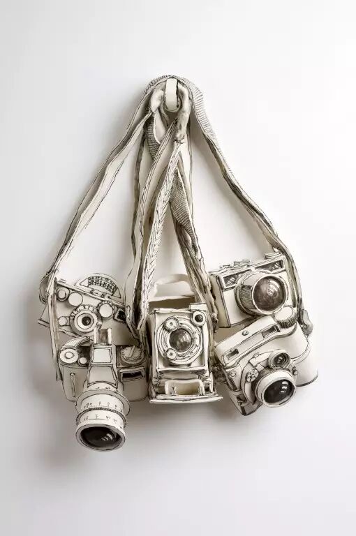 她创作的内容大多是带有复古味道的物品,例如相机、打字机、桌椅、缝纫机、书本、花篮等。制作过程中省略了上釉的步骤,直接在白色陶瓷上用黑色颜料描绘出歪斜的笔触感,就像是从画纸上活生生跳出来的铅笔插画。