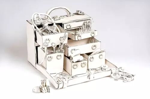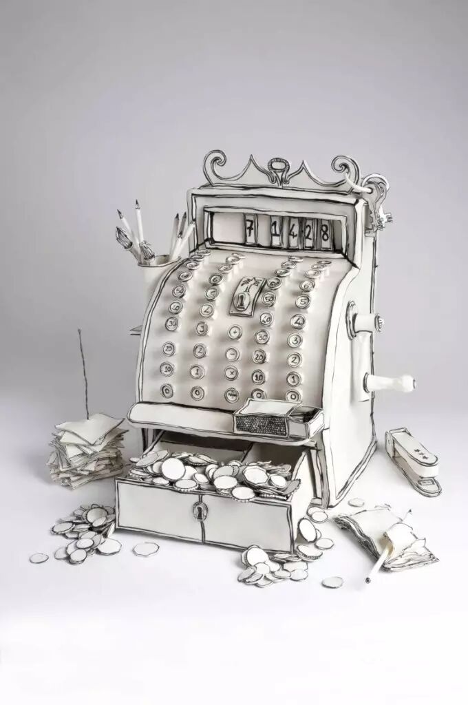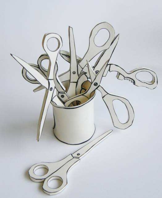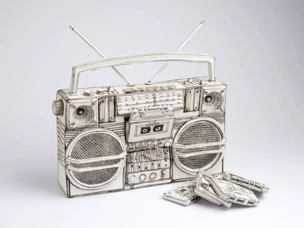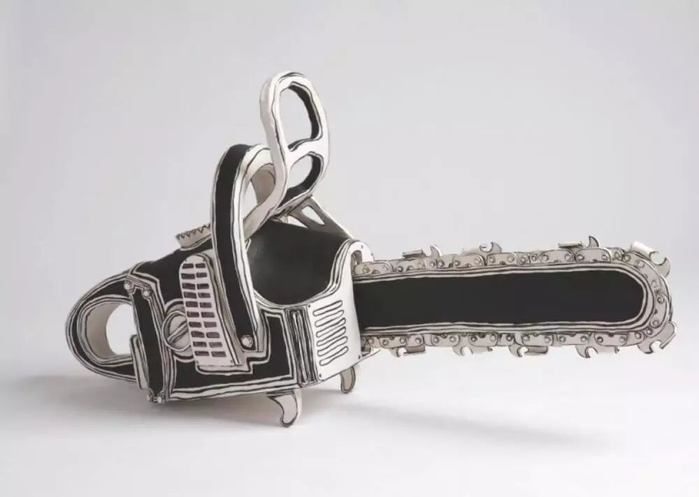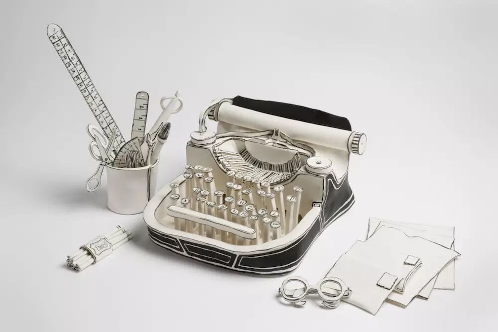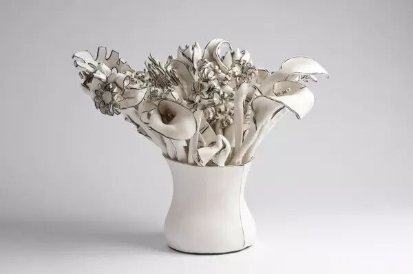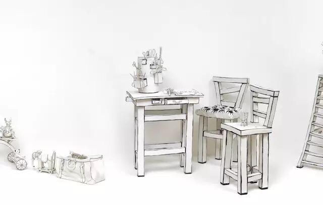 她创作的内容大多是带有复古味道的物品,例如相机、打字机、桌椅、缝纫机、书本、花篮等。制作过程中省略了上釉的步骤,直接在白色陶瓷上用黑色颜料描绘出歪斜的笔触感,就像是从画纸上活生生跳出来的铅笔插画。