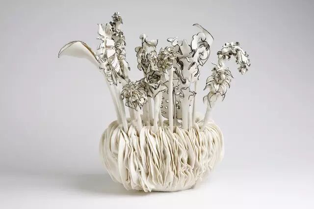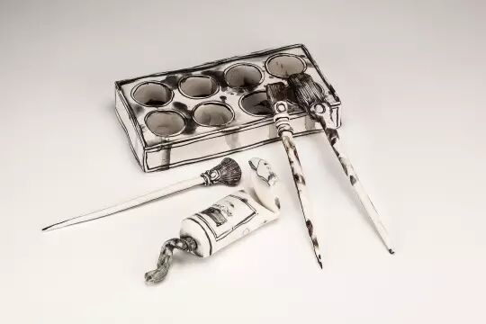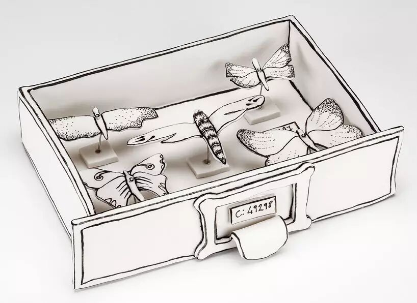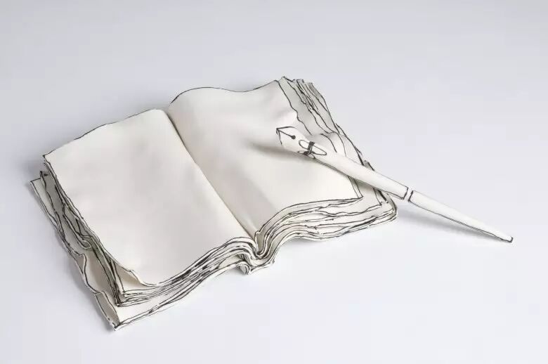 这些二维与三维结合、黑白对比色调的作品灵感,来源于草稿的概念以及 Katharine Morling 对失忆症的感悟。每次创作一个作品前,患有失忆症的她都要花费很多时间先画草稿,透过这些瓷器表达对字句阅读的恐慌感。