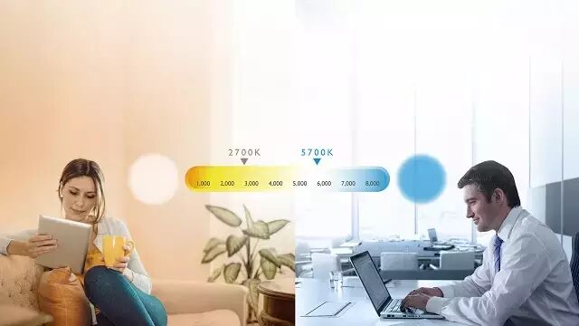 需要专心工作时,可以将灯光调节至偏冷的高色温;要为家里增添一点情调,或想在家翻翻杂志放松心情,可以将灯光调节至温暖的低色温。