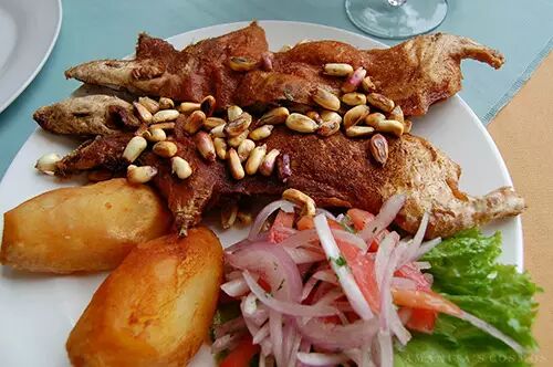 天竺鼠在美国是个很可爱的宠物,但在秘鲁安地斯山的高原里,天竺鼠可是个家喻户晓的美食,是通常在假日或是节庆的时候才会吃的大餐,大概跟美国感恩节吃烤火鸡的感觉很像,在Cusco大教堂里耶稣最后的晚餐的画中,桌上的菜有一道就是天竺鼠,可见天竺鼠在一般高原秘鲁人的饮食中有多重要。