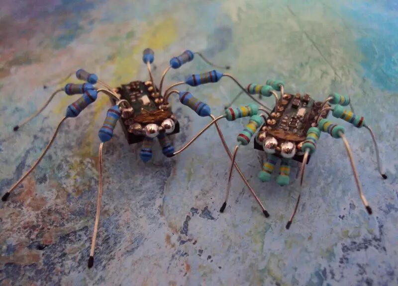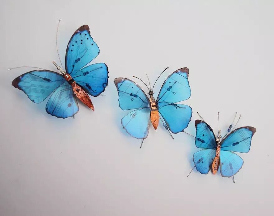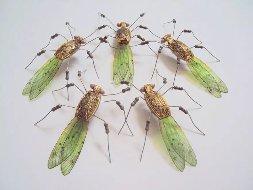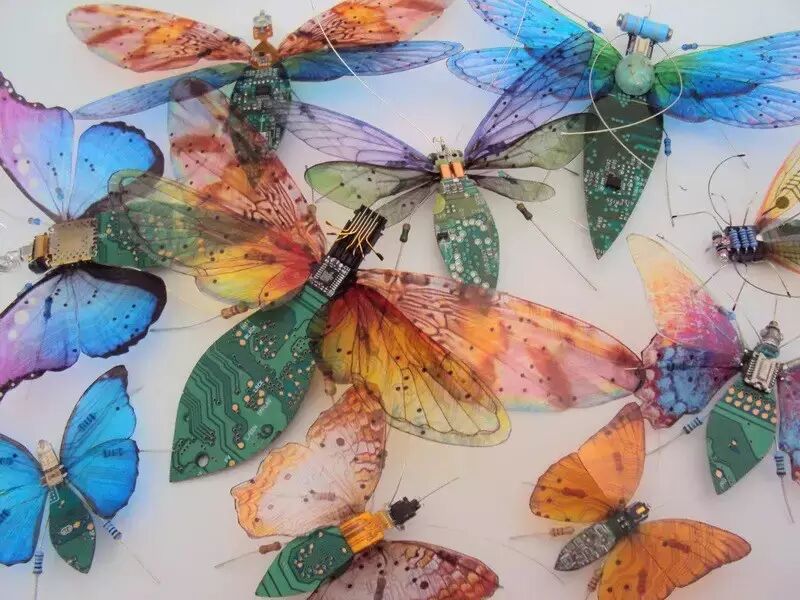 英国艺术家 Julie Alice Chappell 就打破了电子产品原有的形态,从环保回收组织拿回来满满一箱的废弃电路板和电子元件,创作出精美梦幻的昆虫模型。