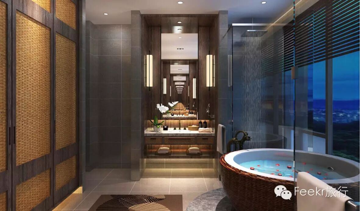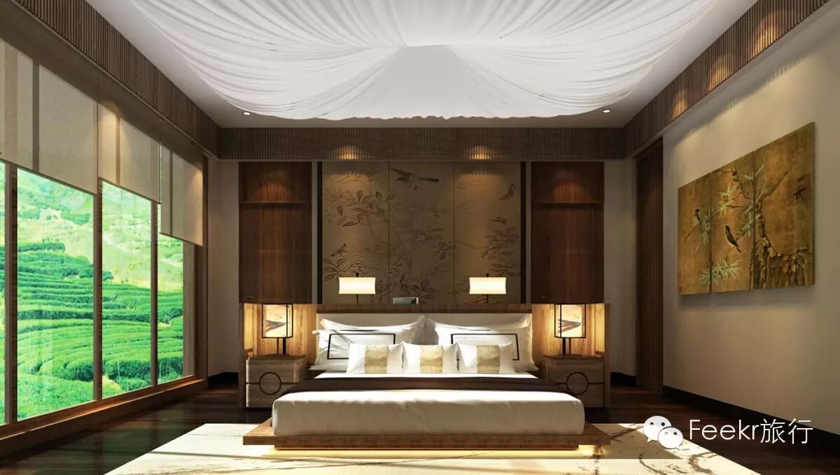 走进浴室,哑光色的地面,显得没有那么冰凉。愿意的话还可以泡在浴缸中,欣赏郁郁葱葱的茶田或是一抹碧绿的湖水,而你与绝妙风景仅有一纱之隔。巧妙的格局,将双卧双卫浴划分的舒适又私密,让我忍不住期盼夜晚的降临。
