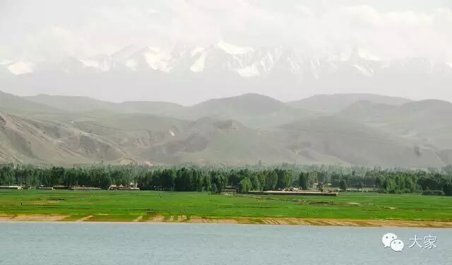 (图注:祁连山上的融雪水,养成河西走廊的绿洲。越过水和绿洲可以望见远处的祁连雪山。只是沙尘天,视线有些模糊。)