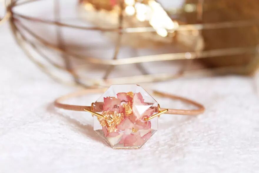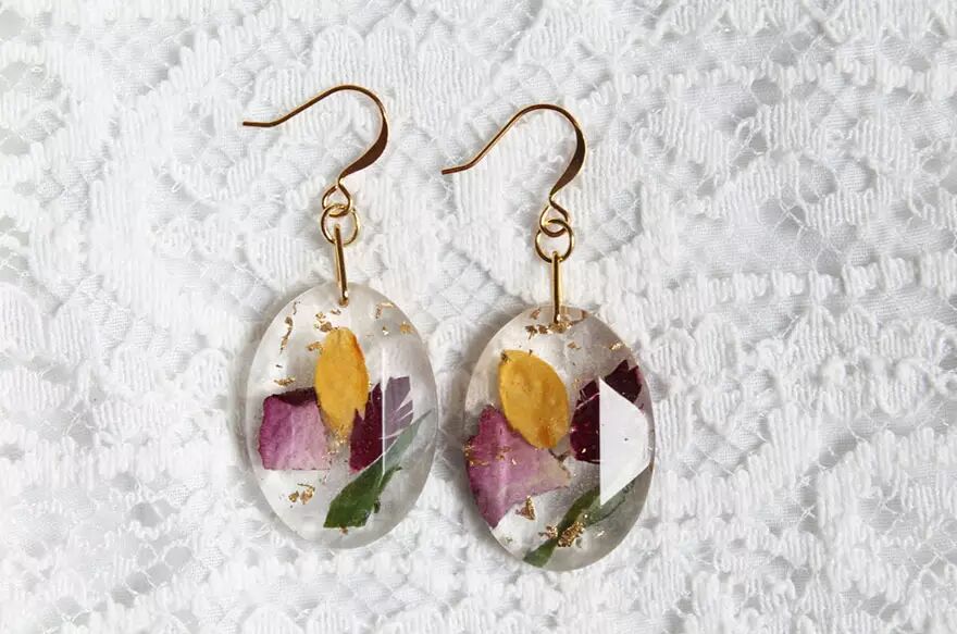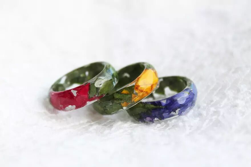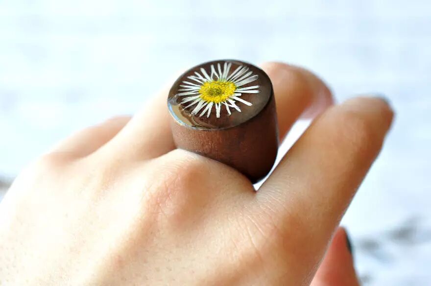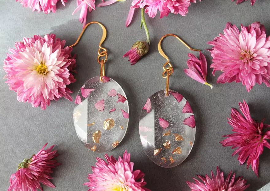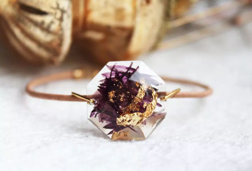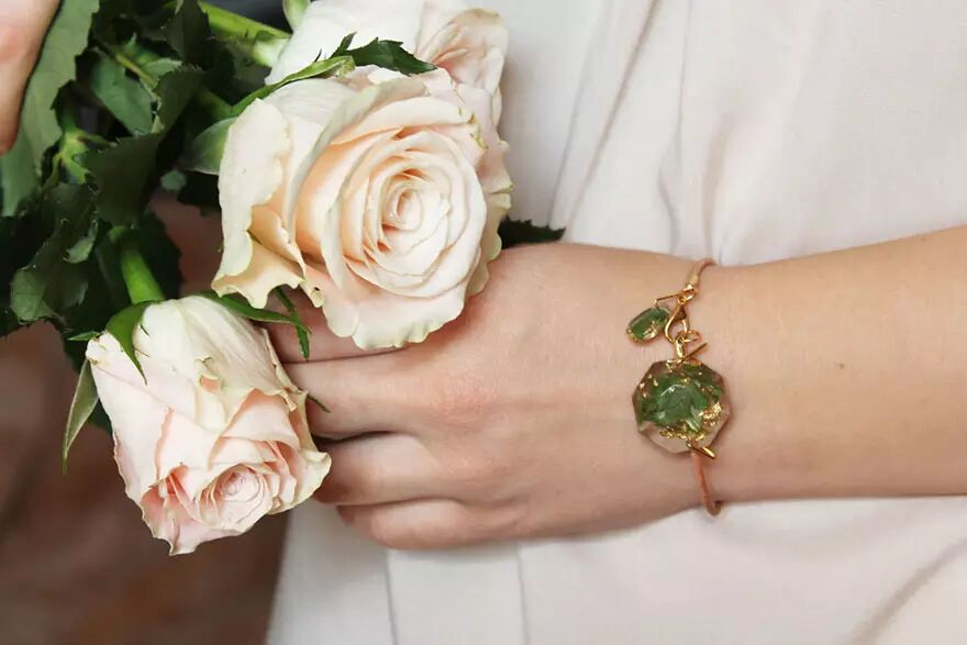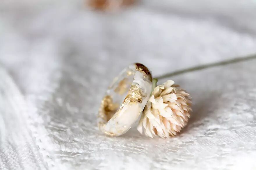 心灵手巧的手艺达人们想到了一个好办法。他们用树脂材料封存干花和自然植物,再加入像金箔一般美丽的金色叶子,制作成戒指、手链、耳环等精致的首饰。人们把它们称「时光宝石」,任凭时光流逝,鲜艳的花朵也可以在这晶莹剔透的小空间里永葆美丽。