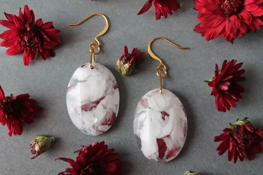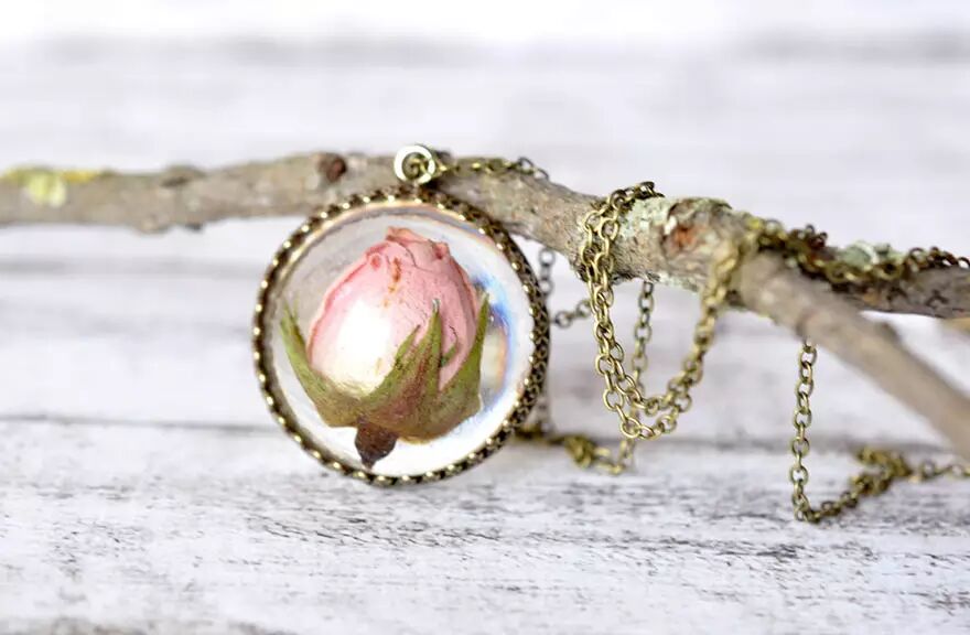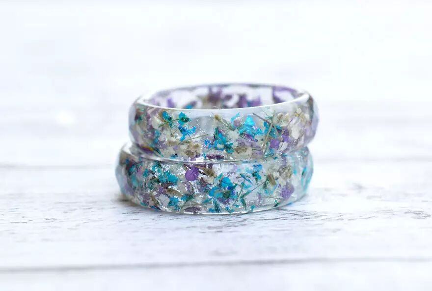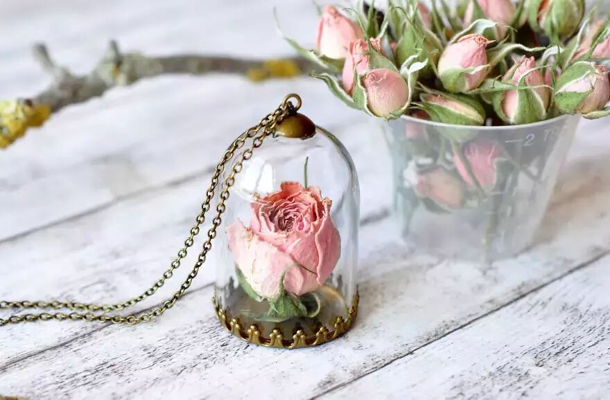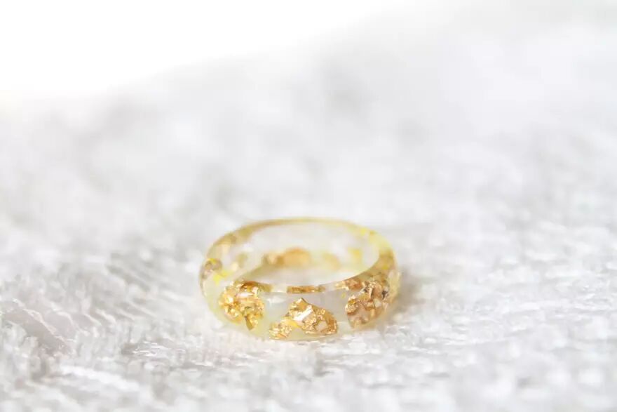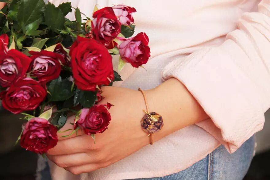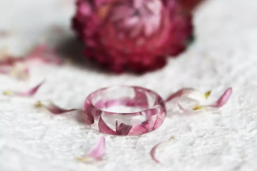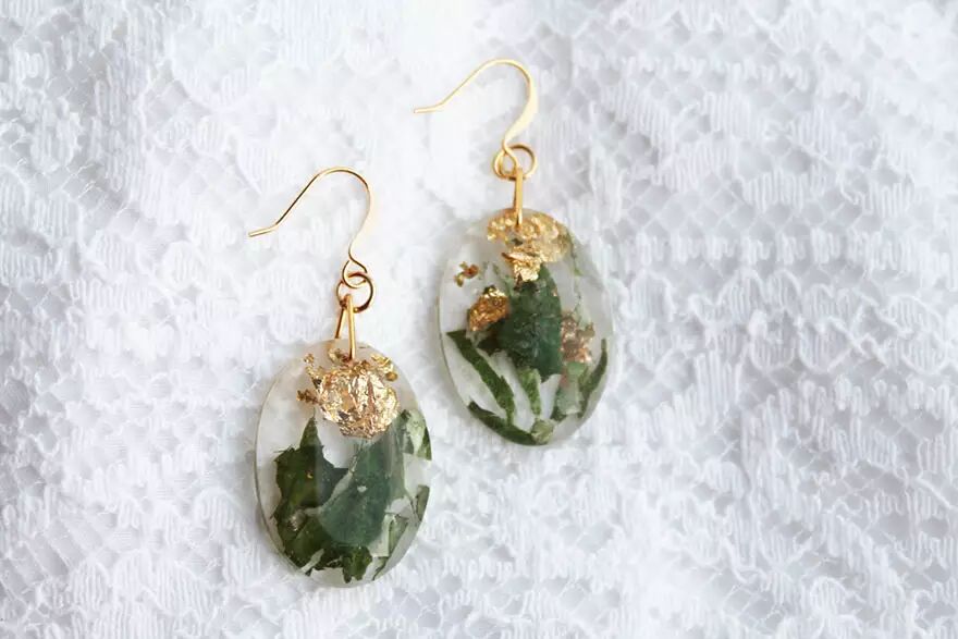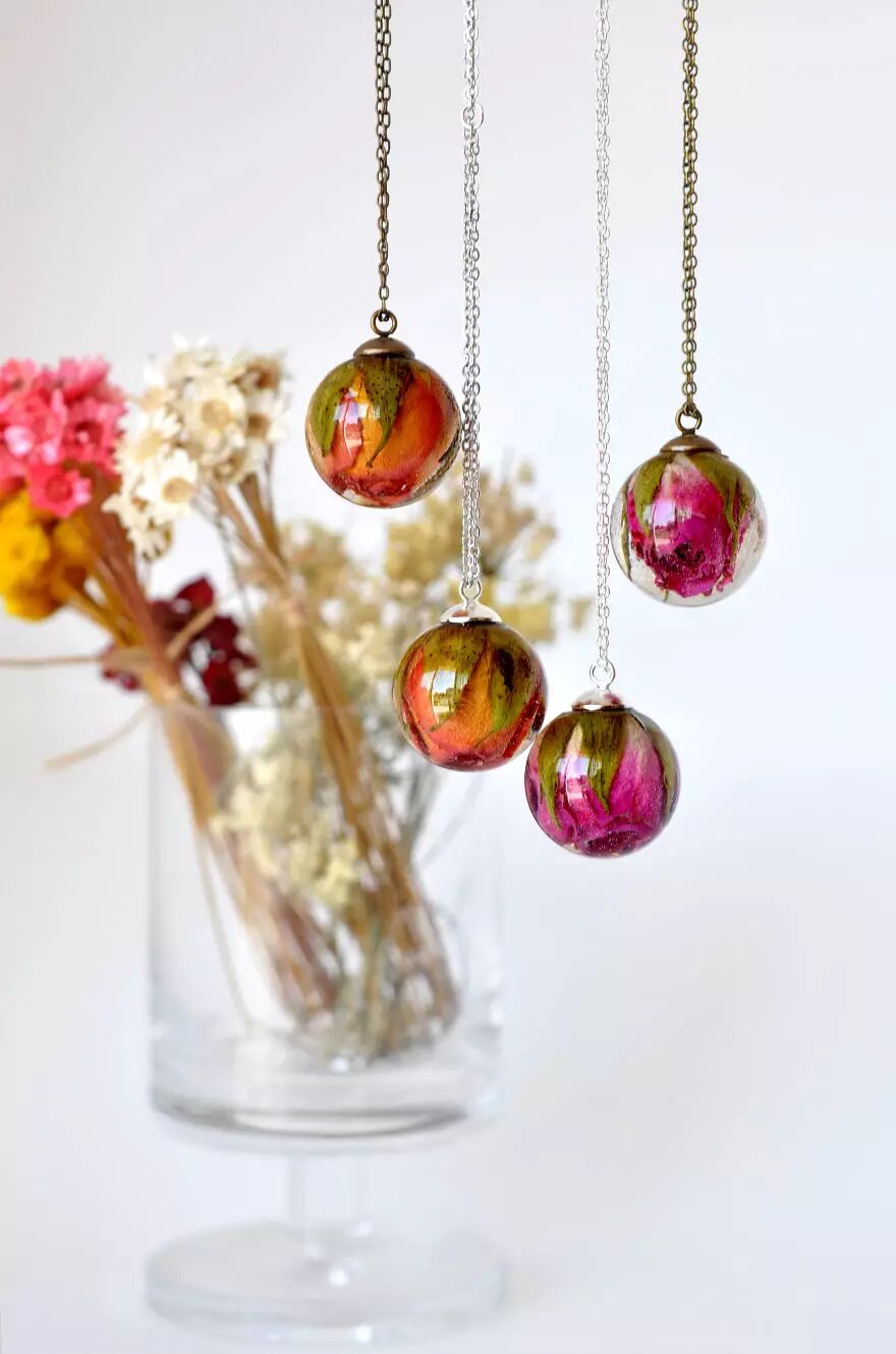 心灵手巧的手艺达人们想到了一个好办法。他们用树脂材料封存干花和自然植物,再加入像金箔一般美丽的金色叶子,制作成戒指、手链、耳环等精致的首饰。人们把它们称「时光宝石」,任凭时光流逝,鲜艳的花朵也可以在这晶莹剔透的小空间里永葆美丽。
