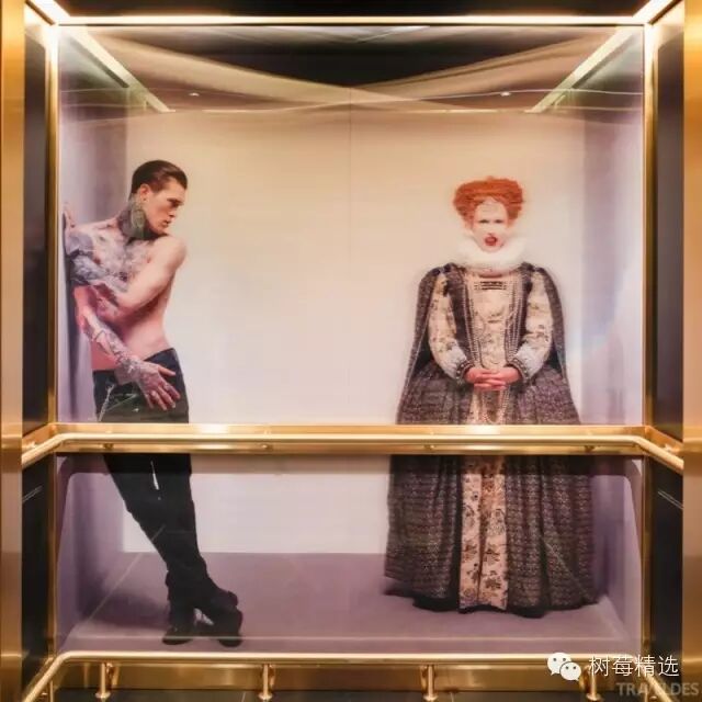 ▲ 就连电梯里面都是Tom Dixon的设计影子, 金灿灿的黄铜色扶手和门框, 还有幽默的英伦元素-邪恶形象的伊丽莎白女王。