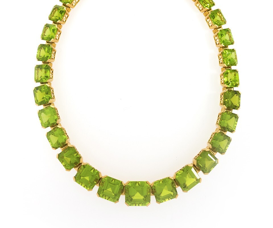 镶嵌29颗正方形切割橄榄石,总重220克拉。