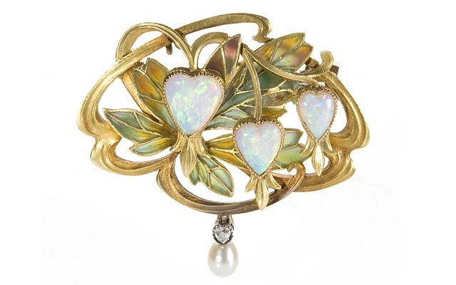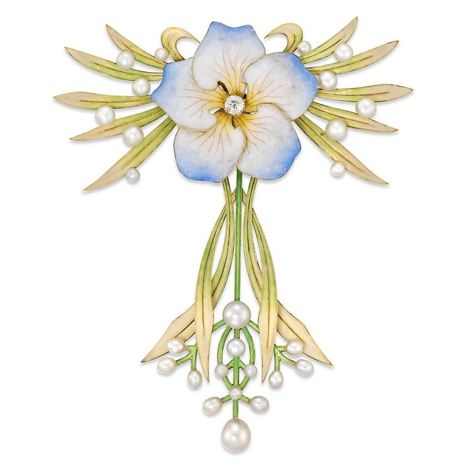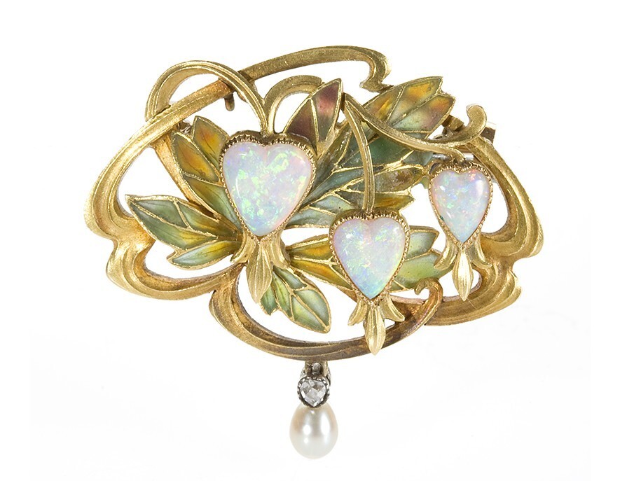 镶嵌三颗心形白欧珀,底部镶有一颗淡水珍珠,以钻石点缀,叶片采用了镂空珐琅工艺。珠宝设计师 Gaston Laffitte 活跃于新艺术运动时期,十分擅长镂空珐琅工艺的运用。
