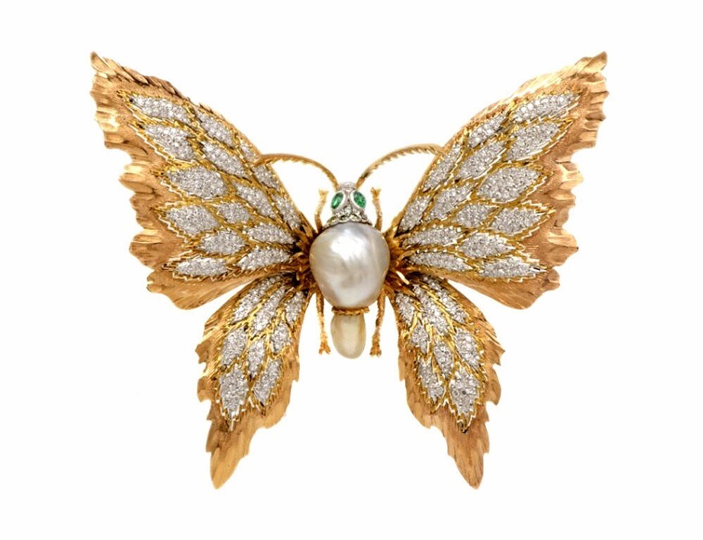 采用18K玫瑰金和18K白金打造,中央镶嵌两颗天然异形珍珠,翅膀均镶有420颗圆形切割钻石,总重达5克拉,眼睛部分镶嵌两颗祖母绿,总重0.10克拉。