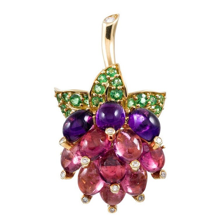 镶嵌弧面切割粉色碧玺、紫晶,以钻石点缀,叶片镶嵌沙弗莱石。