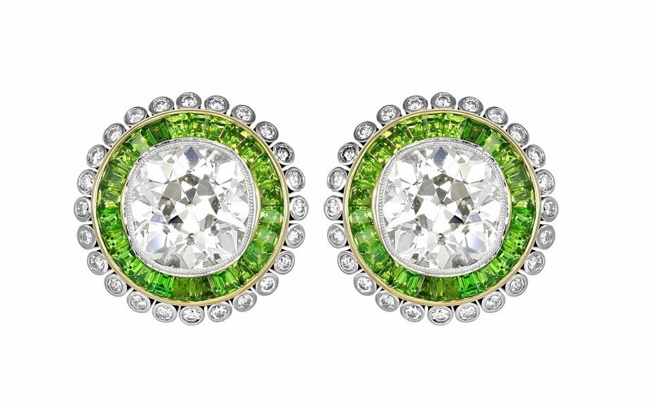 镶有两颗枕形切割钻石,重量分别为4.52克拉和4.63克拉,周围镶有一圈翠榴石和一圈钻石。