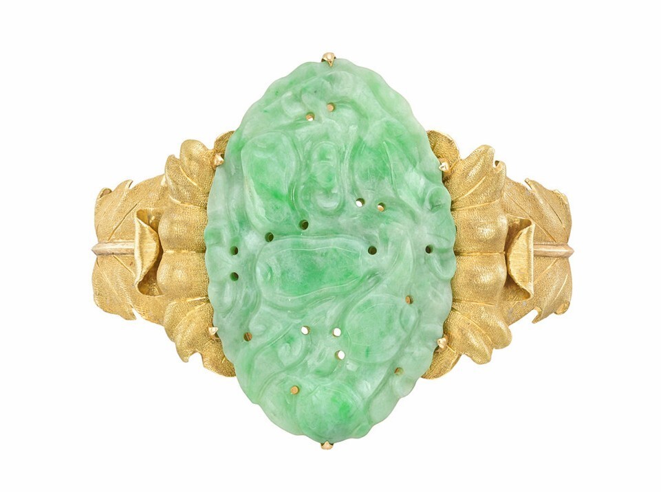 镶有一块 46×32mm 的椭圆形翡翠玉雕,黄金手镯表面雕有叶片造型。