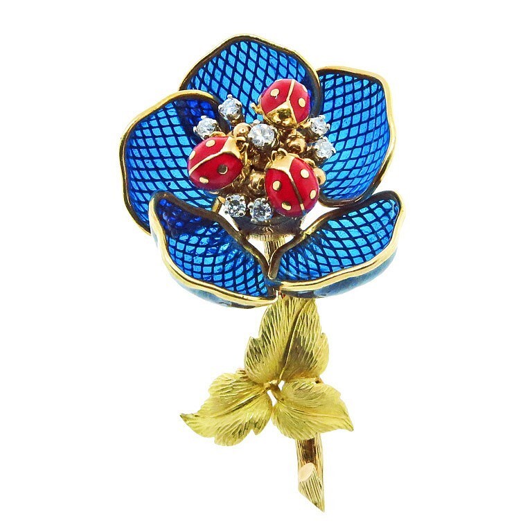 由黄金打造,表面采用珐琅材质,以钻石点缀,可作为挂坠、胸针佩戴。