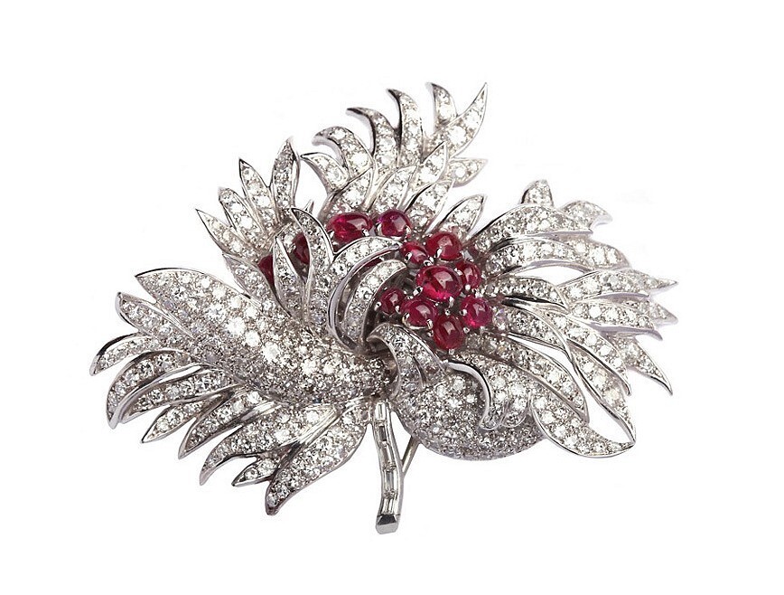 铂金镶嵌5克拉弧面切割红宝石,叶片镶有总重18克拉的钻石。