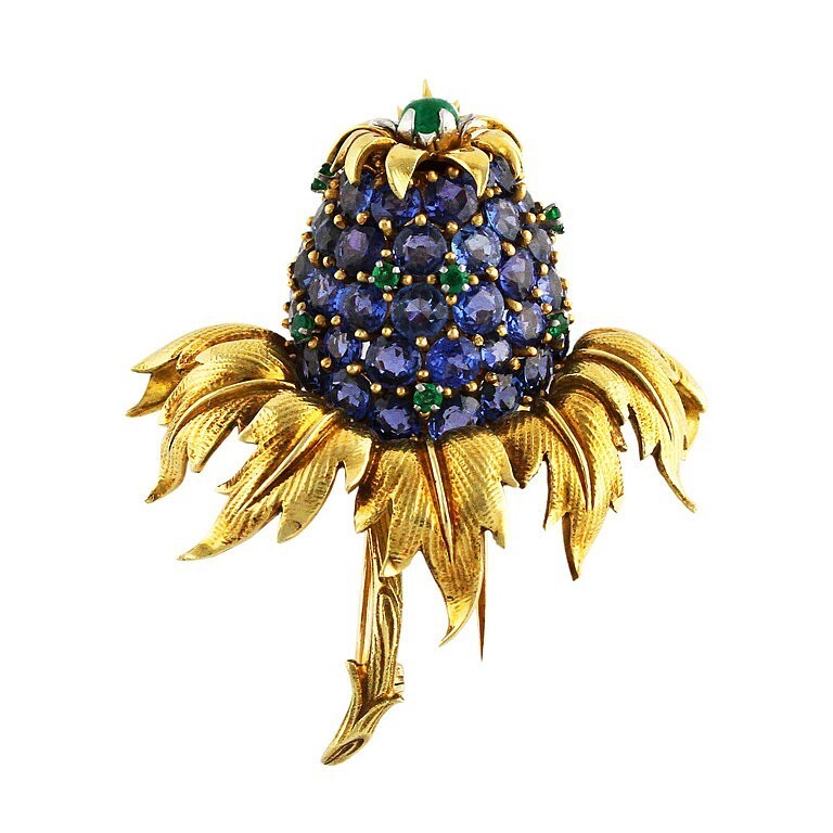 镶有48颗圆形蓝宝石,总重15.00克拉,7颗祖母绿总重0.20克拉,蓟花造型顶部的弧面切割祖母绿重约0.50克拉,由 Tiffany 当时的设计师 Jean Schlumberger 设计。