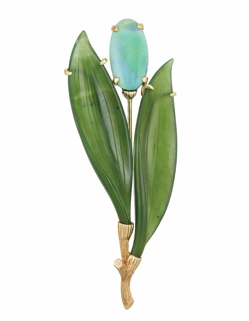 镶有两颗叶片造型软玉,中央镶有一颗欧泊,重3.35克拉。