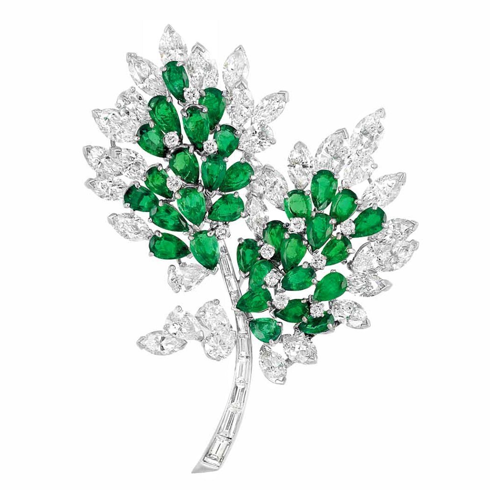 镶有32颗梨形切割祖母绿,总重8.50克拉,周围镶嵌26颗榄尖形和8颗梨形切割钻石,总重15.00克拉。