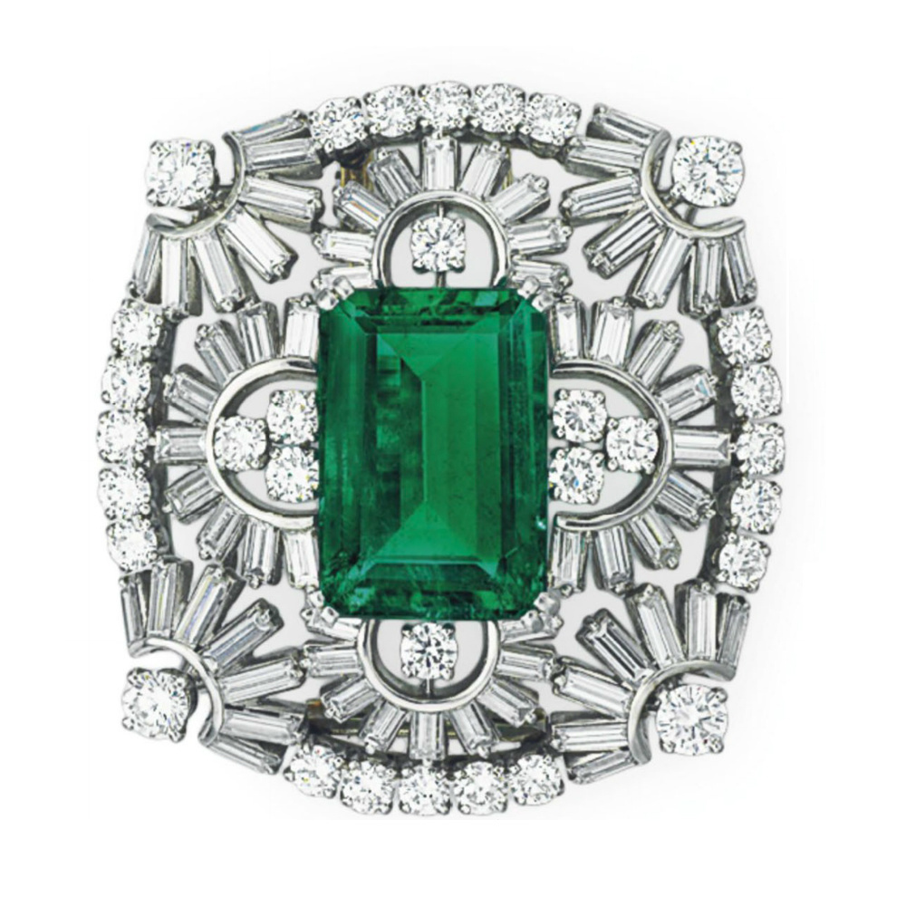 这枚胸针用圆形和长方形切割钻石组成了对称的几何镂空图案,中间镶嵌一颗6.15ct的阶梯形切割祖母绿作为主石,经鉴定这颗祖母绿产自哥伦比亚,微油处理。