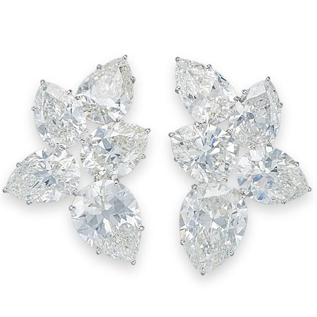 本次拍卖会也将拍卖多件 Harry Winston 的珠宝饰品,其中最受瞩目的是一对钻石耳夹。各由5颗大小不一的梨形切割钻石组成,钻石重量从2.97ct至6.88ct不等