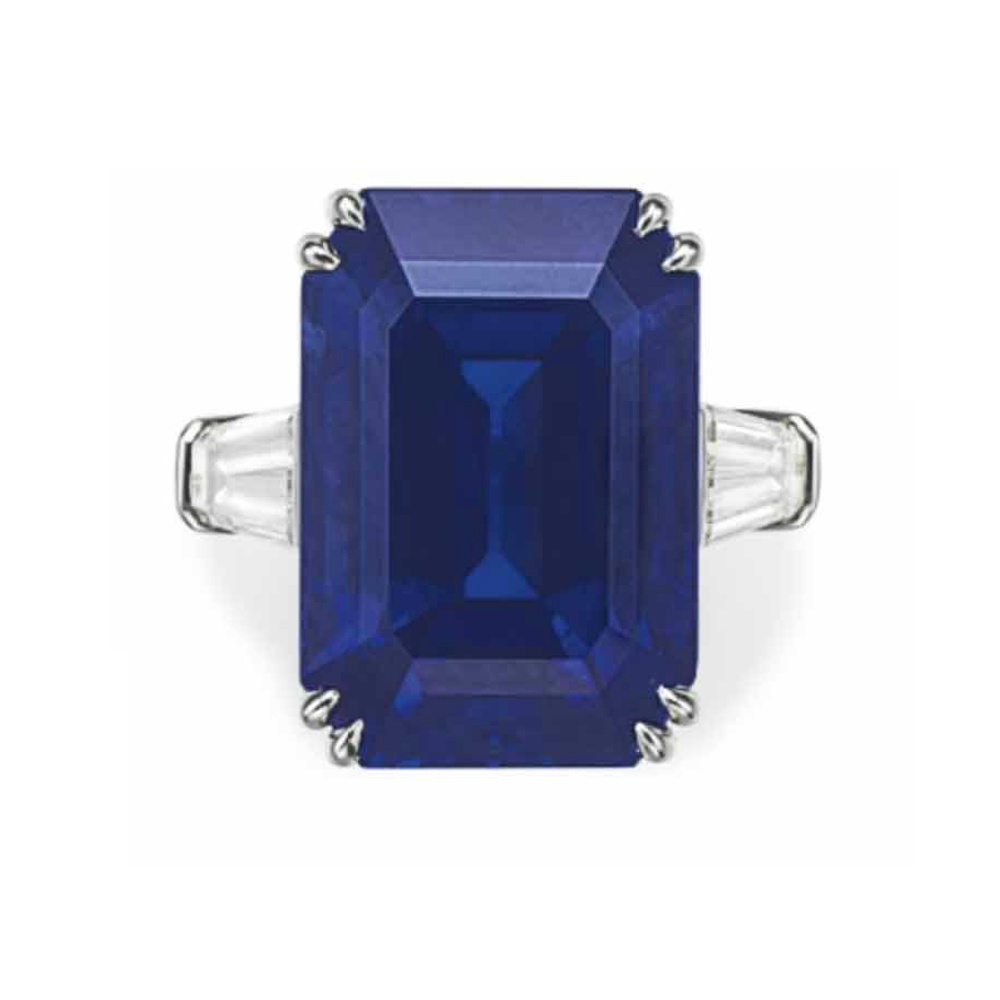 主石为一颗38.40ct长方形切割蓝宝石,产自斯里兰卡,没有经过优化处理。戒托采用铂金材质,两侧镶嵌阶梯形切割钻石。