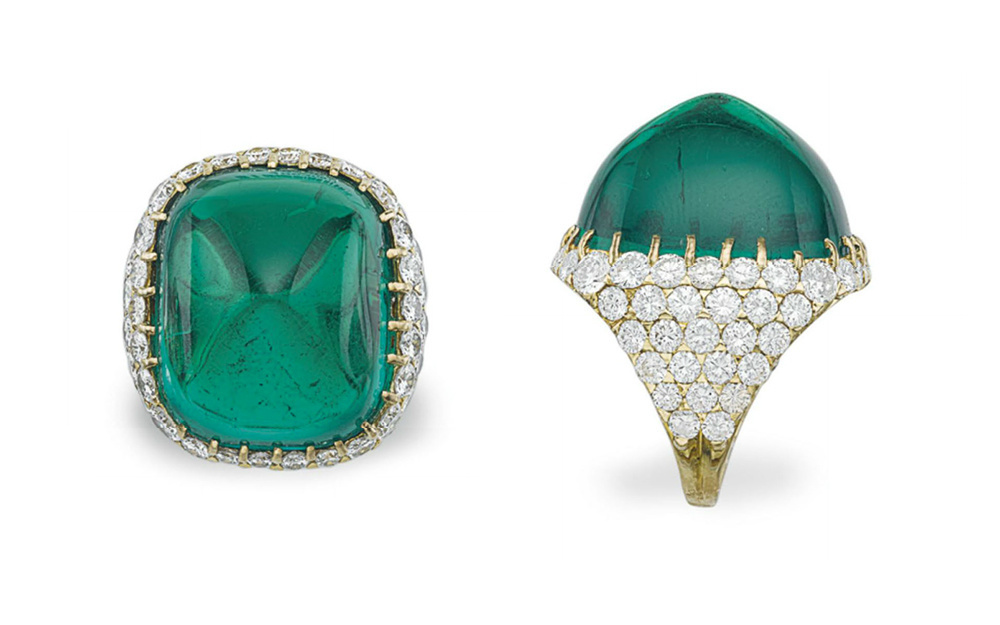 主石为一颗戒面切割祖母绿,重达53.46ct,产自哥伦比亚,微油处理。戒托采用黄金材质,密镶圆形钻石。