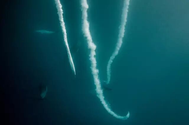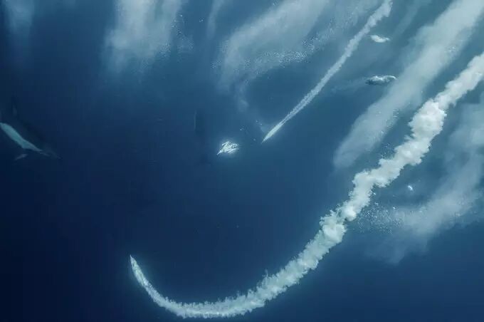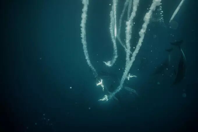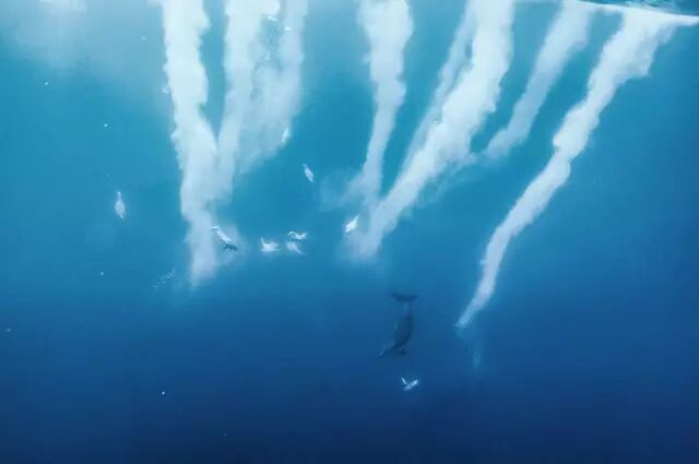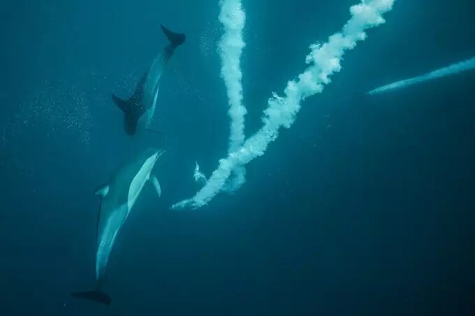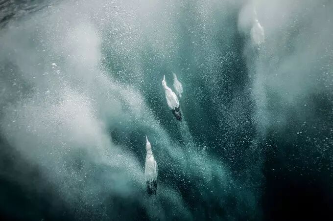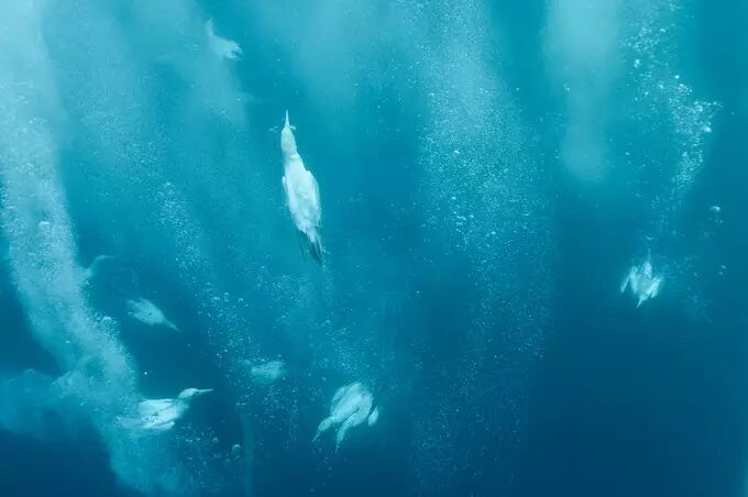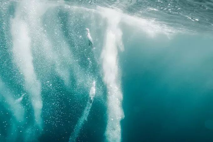 因为天空开始被大量乌云遮盖住,所以光线和能见度变得更差,但鲣鸟入水的轨迹,仍然就像一个洲际导弹的弹道一样清晰。