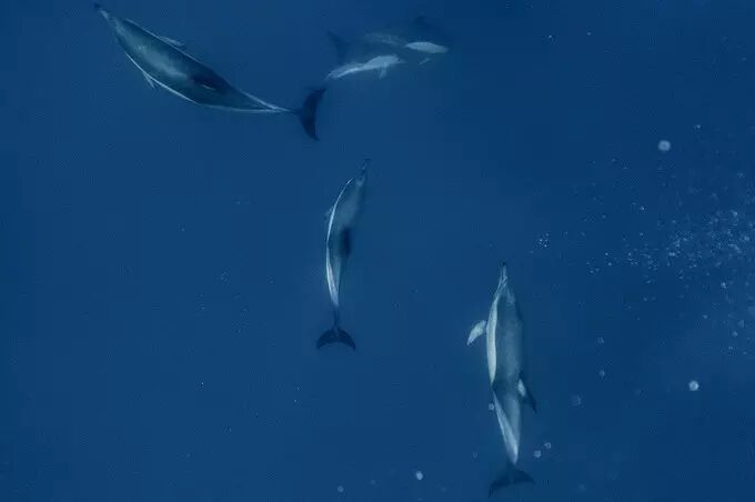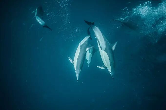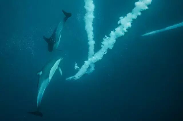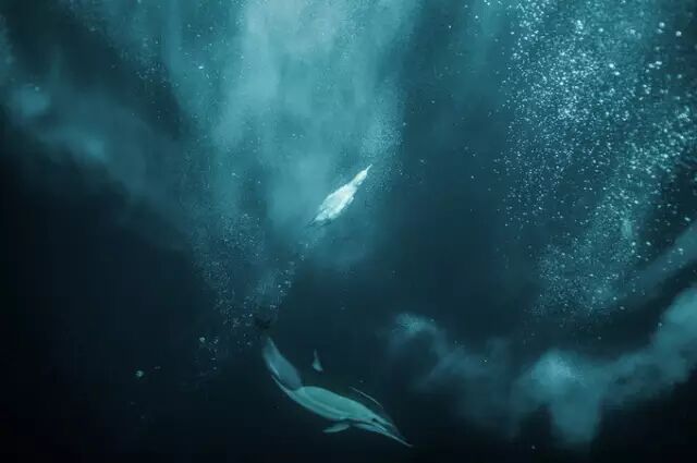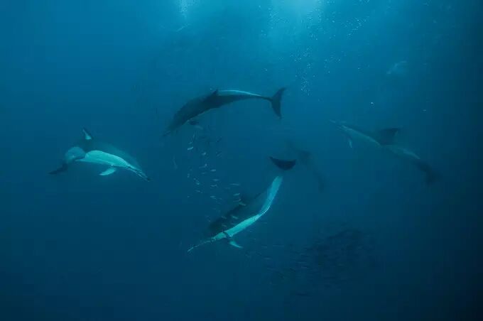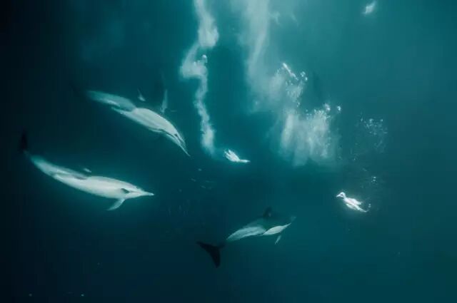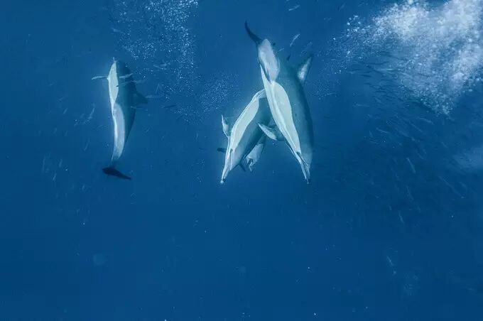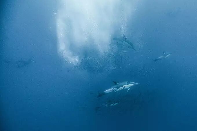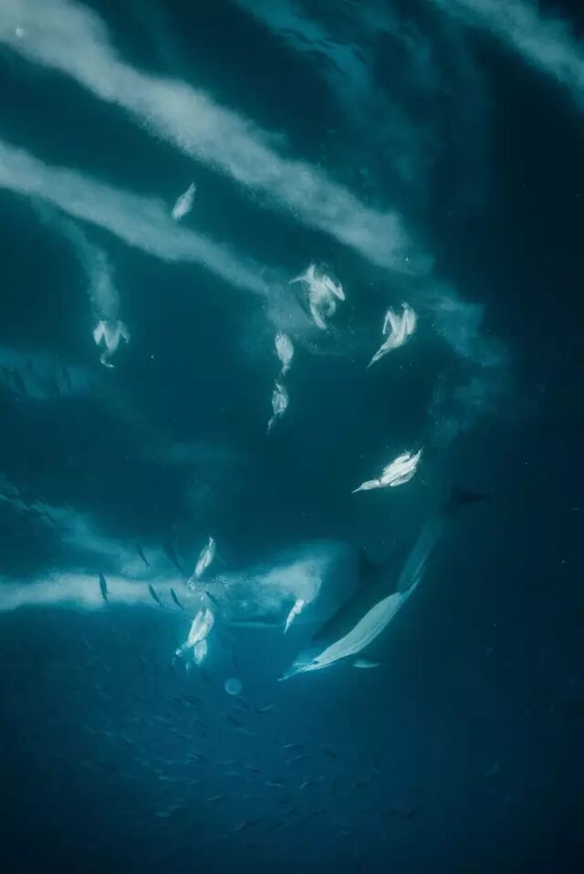 海豚们还在围攻鱼群,此时海里并非想象中的那么安静,而是充满了它们鸣声协同进攻的叫声,鲸鱼的长调,还有鲣鸟入水的声音。