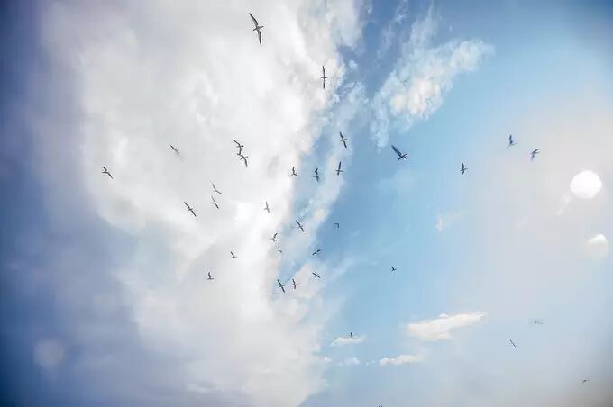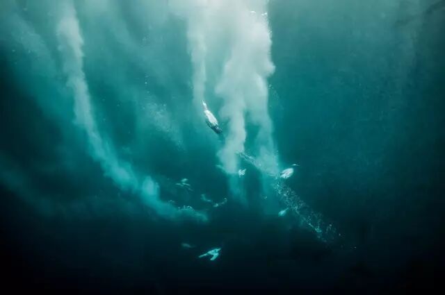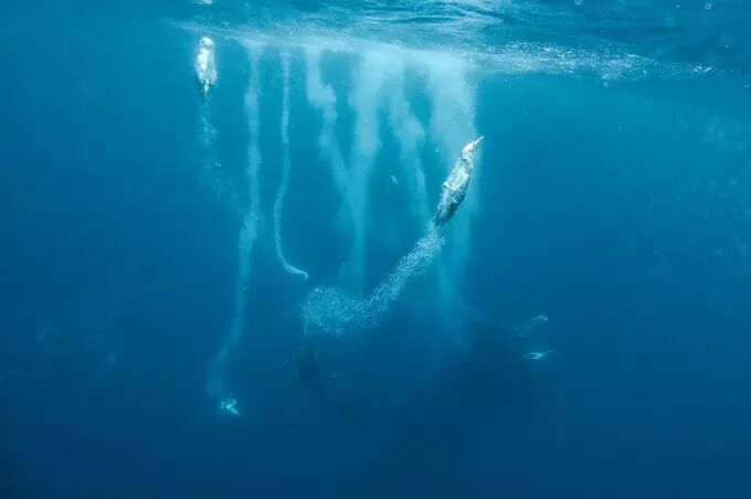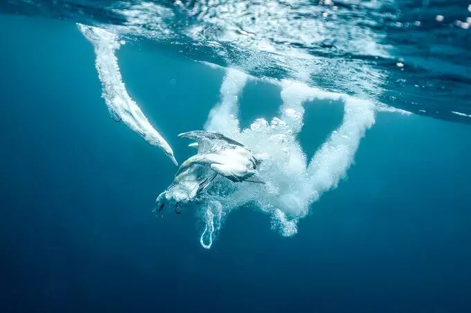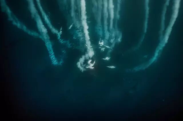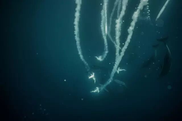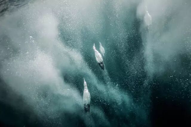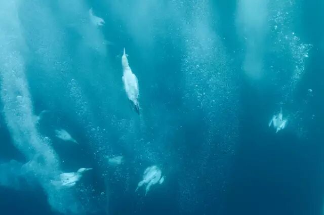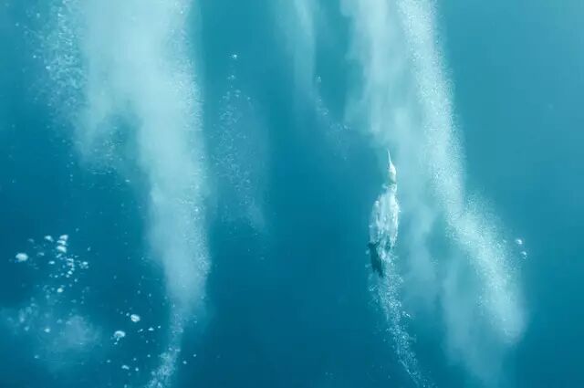 鸟群啼鸣着逆风而翔,然后空中准确定位瞄准好鱼群后,瞬间完成转身,变成顺风俯冲,收翅!重力加速度!最后身体呈为完美的流线形,大约以每小时120公里的速度扎破海面,给人以强烈的视觉冲击力,特别在水下,鲣鸟俯冲下来,形成一条白色的水雾线条,其实图片很难表现出那种气势,漫天的鸟鸣声,不断有鲣鸟在身边呼啸冲入水中,海中水花四溅,加上冲入水时,噗嗤噗嗤的响声,非常的震撼!