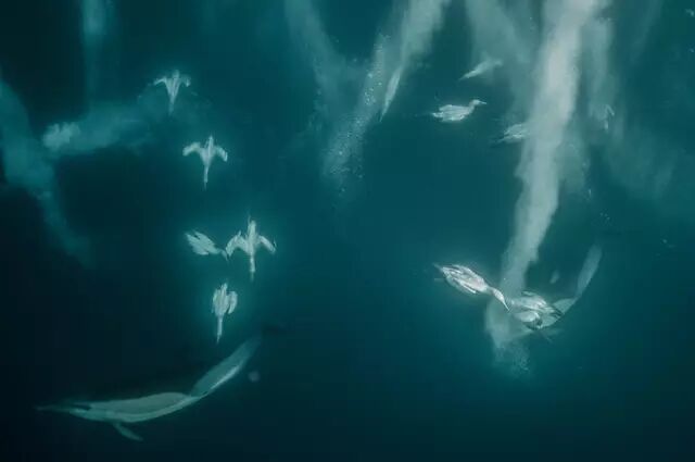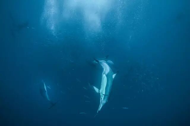 鲣鸟懂得借助海豚群冲击沙丁鱼球导致局面混乱时,大量俯冲入海,这样更容易扑食落单的沙丁鱼。