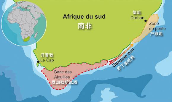 每年5月到7月间,数十亿计的沙丁鱼就从厄加勒斯浅滩出发,沿着南非东岸向北迁徙,目的地是德班附近的北部海域,路线长度超过1000公里。