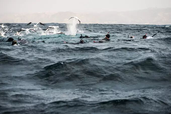 日复一日,我们在非洲大陆最南端的日出之时,在阴冷中穿上湿透的潜水衣,穿破层层巨浪去寻觅海中巨兽。一次次经历失望,终于在行程的最后一天与沙丁鱼群不期而遇!
