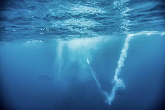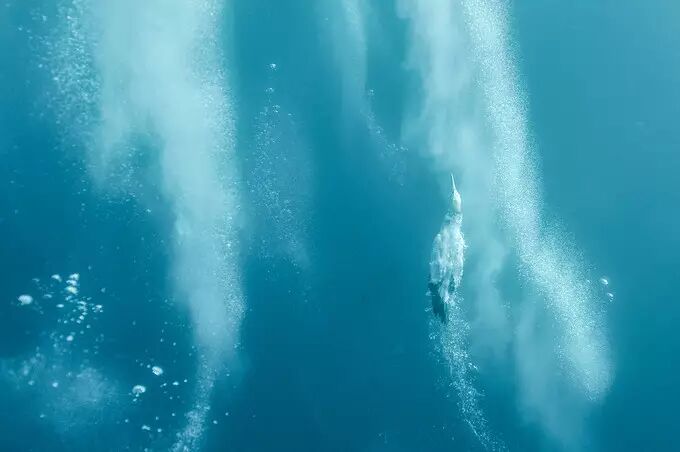 鲣鸟扎入水底形成的V字型白色水雾线条