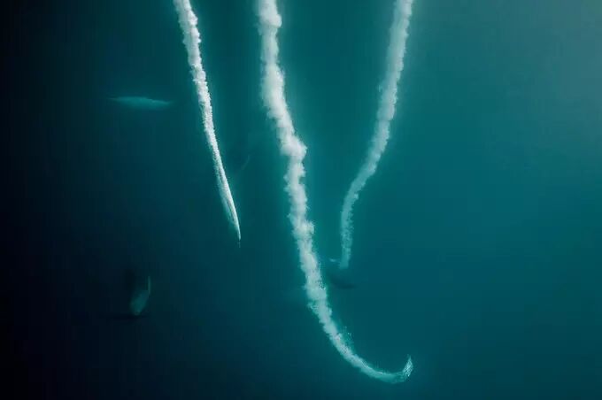 成群的鲣鸟俯冲而下,扎破我面前近在咫尺的水面,冲入水中啄食鱼群,海豚群同时也将包围圈合拢冲进鱼群,成群的鲨鱼就在脚下伺机而动,巨大的布氏鲸,从水底垂直冲破水面鲸吞鱼群,再溅起起滚滚白浪。