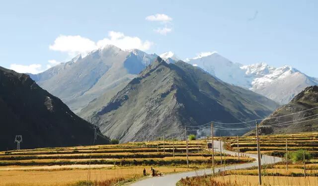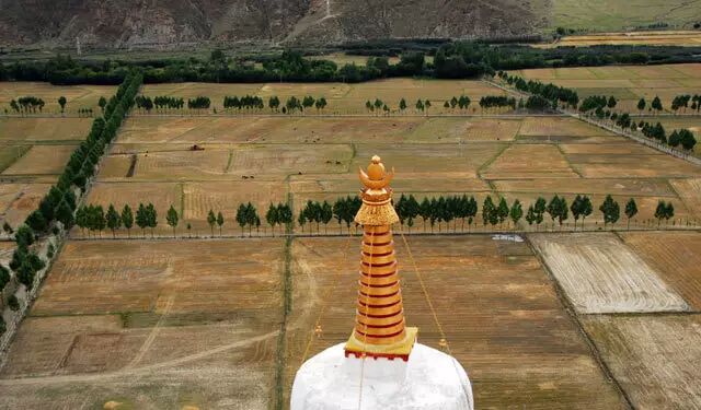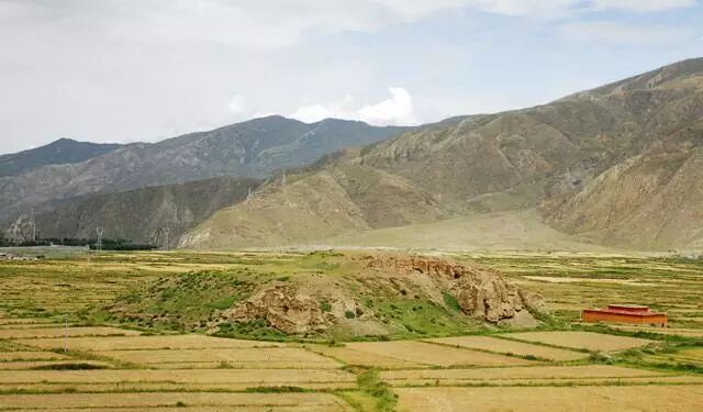 就在这样的情景中溯河而上,地势渐渐抬升。还未收割的庄稼地出现了。一片片沉甸甸的金黄和蓝天相互映照,除了穿过田野的公路,以及田野里的输电线路,一千多年前,这片河谷应该就是这样的景象。吐蕃第八代赞普布德贡杰统治时期,雅砻部落已经有了发达的农业。只是按历史的写法,这样的功绩,总是归之于帝王。藏文史书《贤者喜宴》中记述道:“其(布德贡杰)聪睿之业绩是:烧木为炭;炼矿石而为金、银、铜、铁;钻木为孔;制作犁及牛轭;开垦土地,引溪水灌溉;犁地耦耕:垦草原平滩而为田亩;于不能渡过的河上建造桥梁;由耕种而得谷物即始于此时。”我们当然不相信,一个国王不论如何聪慧睿智,也不可能同时做这么多事情。却可以相信,在他的统治时期,他鼓励和倡导着技术文明的进展。如果换一种历史观,也许这样的国王才是比那些开疆拓土,强力推广佛法的国王更多造福了子民的伟大而贤明的国王。