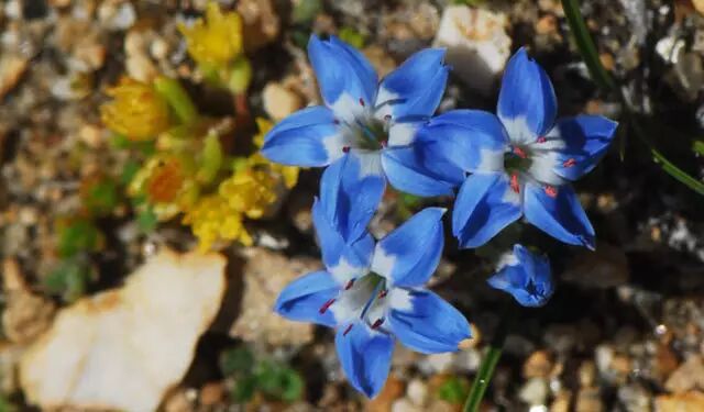 再次停车,已经到了4800米的高度上。那是一片碧绿的草坡,上面有牧人的帐幕和羊群。羊群从半坡上一直散布到浑圆的山梁上。山梁背后,是不知深浅的峡谷。一座陡峭的岩石山峰从峡谷那边升起来,直刺蓝天。青色的石壁被阳光照亮,带着金属的光泽与质感。但看不见雪山。我爬上那道山梁,意图是可以从那里看见雪山。用了半个多小时,终于气喘吁吁地上了那道山梁。眼前所见,只是脚下的深峡,和深峡对面更显高峻的岩石山峰。依然没有看见雪山。我意识到从这条路线,可能看不见雪山。于是转而去看脚下的植被。浅浅的牧草中间,星星点点的蓝色花在盛开。这是属于秋天的龙胆花在贴地开放。我伏下身来,细细地拍摄这些美丽的蓝色花。那是比背后的洁净深邃的天空更深的蓝。眼前有两种龙胆,花朵大的那种我认识,华丽龙胆。一簇簇紧挨着,花丝伸出花冠,还顶着紫红花药的那种是第一次看见。满坡都是半球形的垫状点地梅。它们的花期已过,但那一团团垫状植株依然颜色苍绿,缀满了草坡。在这样的高度上,植物都改变了形态。低矮,多毛,紧挤在一起,变成了垫状。我还发现了一种开黄花的虎耳草。花朵还是和别处所见一模一样。但叶子的形态却变化了,变成了厚厚的肉质叶,贴着地紧叠在一起,成为植物学描述中的石莲叶。